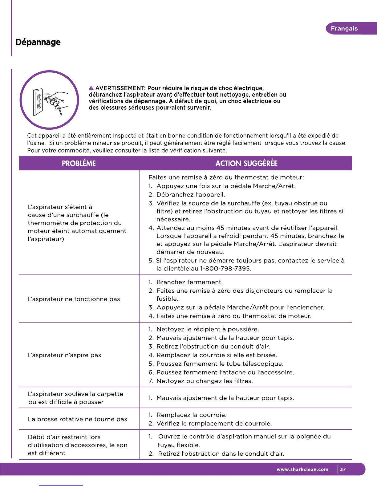 5. Si l’aspirateur ne démarre toujours pas, contactez le service à