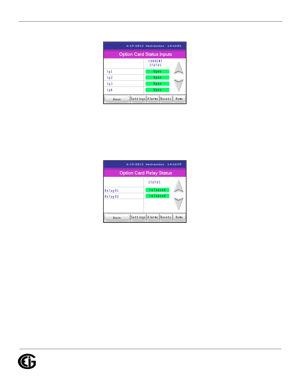 Option Card Relay Status screen
