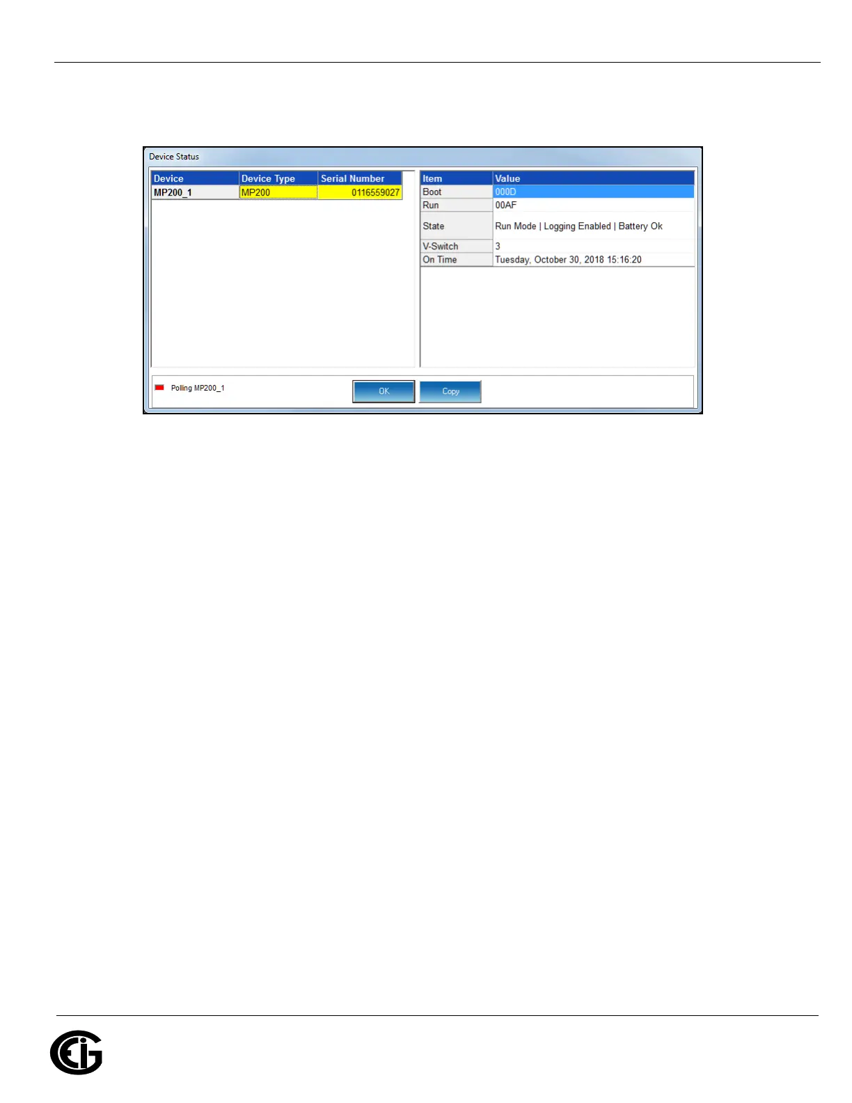 6. You will see the MP200 metering system’s Device Profile screen. The menu on the