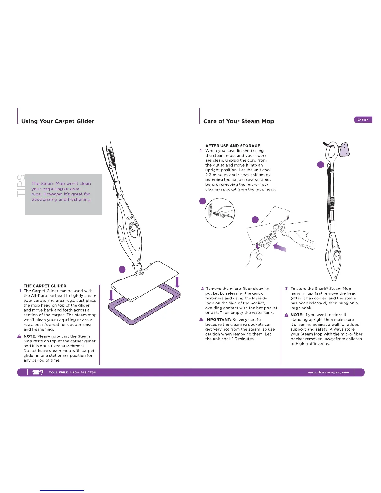 Shark S3501W - Using Your Carpet Glider; THE CARPET GLIDER; Care of Your Steam Mop; AFTER USE AND STORAGE