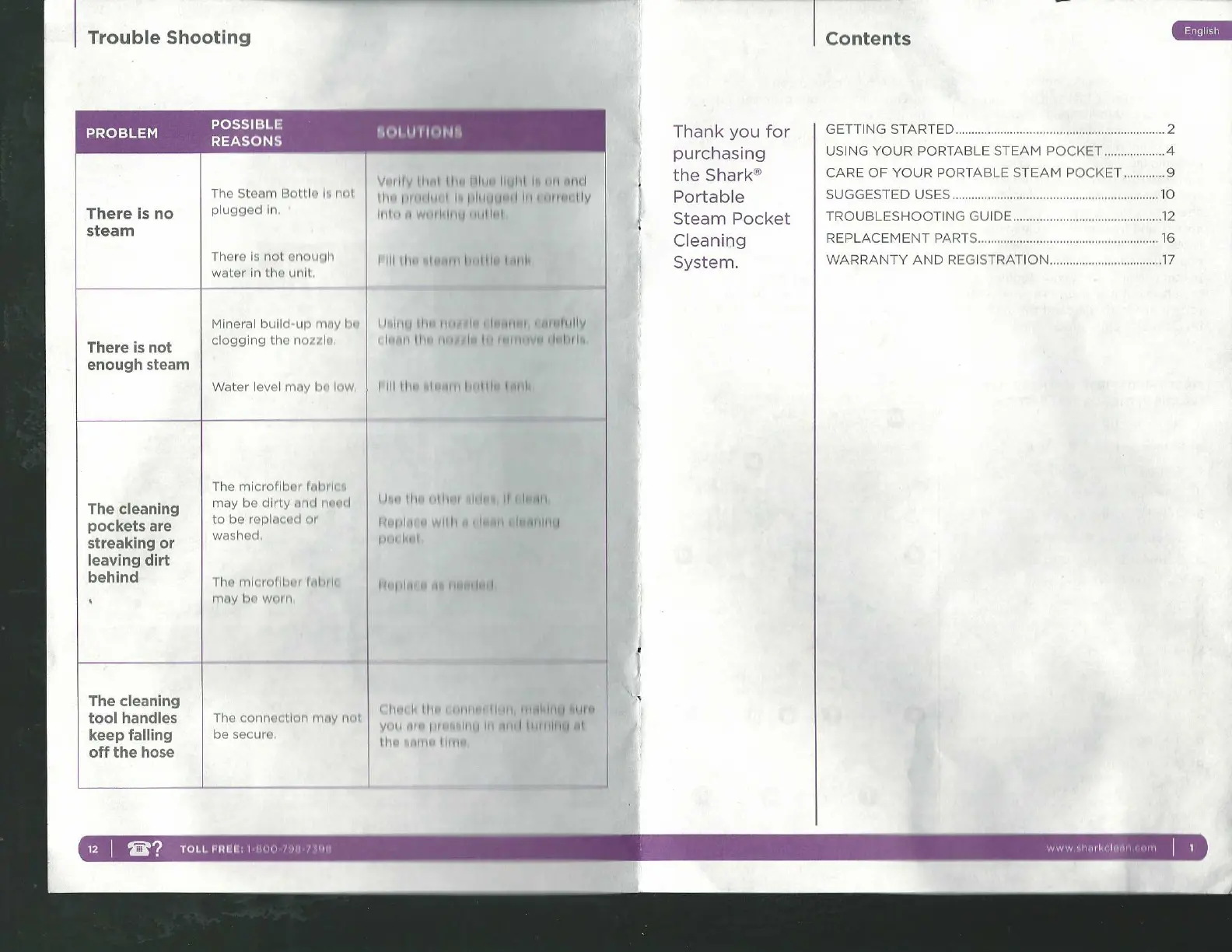 Shark SC630 - Trouble Shooting; No Steam Issue; Insufficient Steam Issue; Cleaning Pocket Streaking