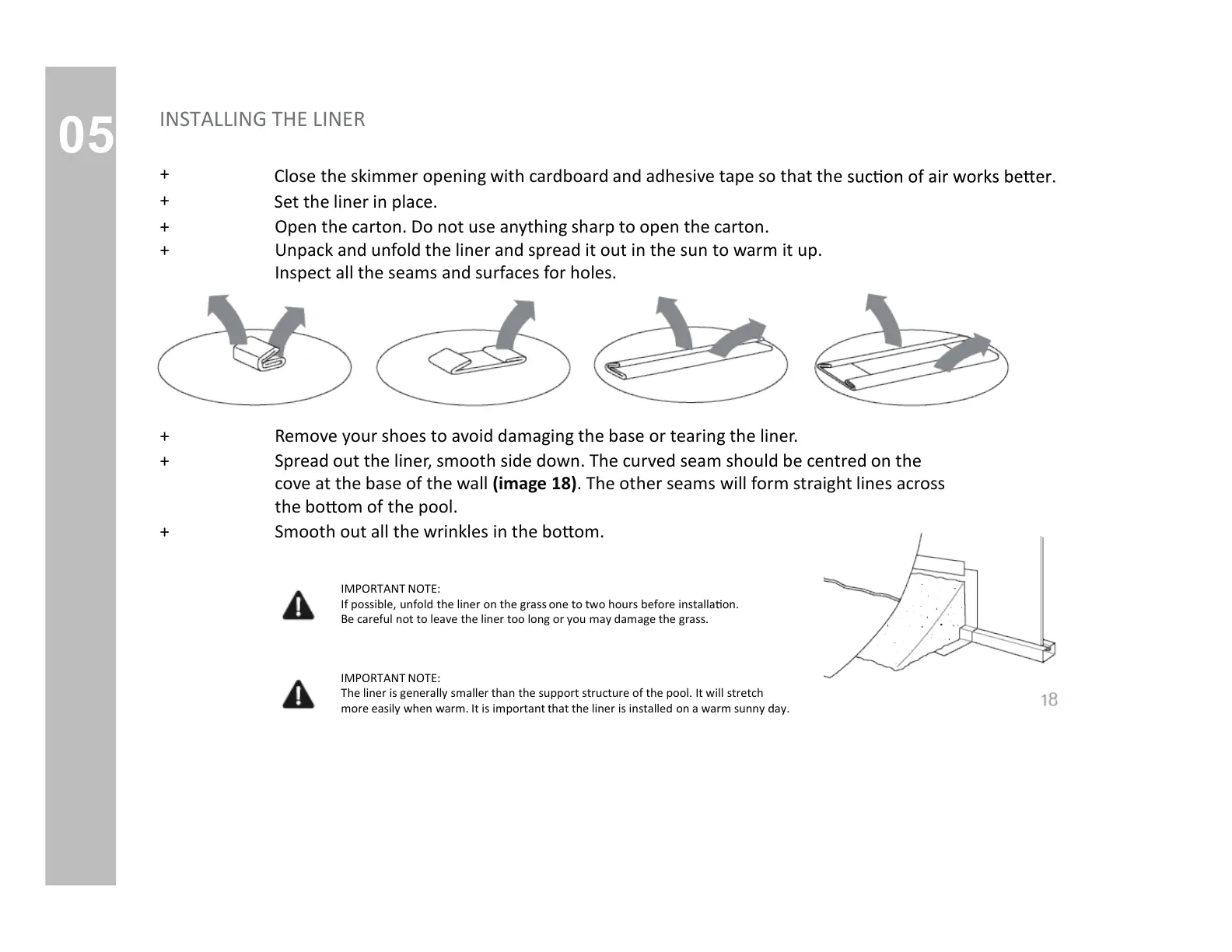 If possible, unfold the liner on the grass one to two hours before installa