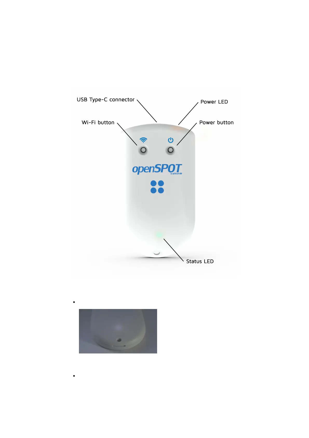 The openSPOT4 has two LEDs: one Status LED and one Power LED. Note that