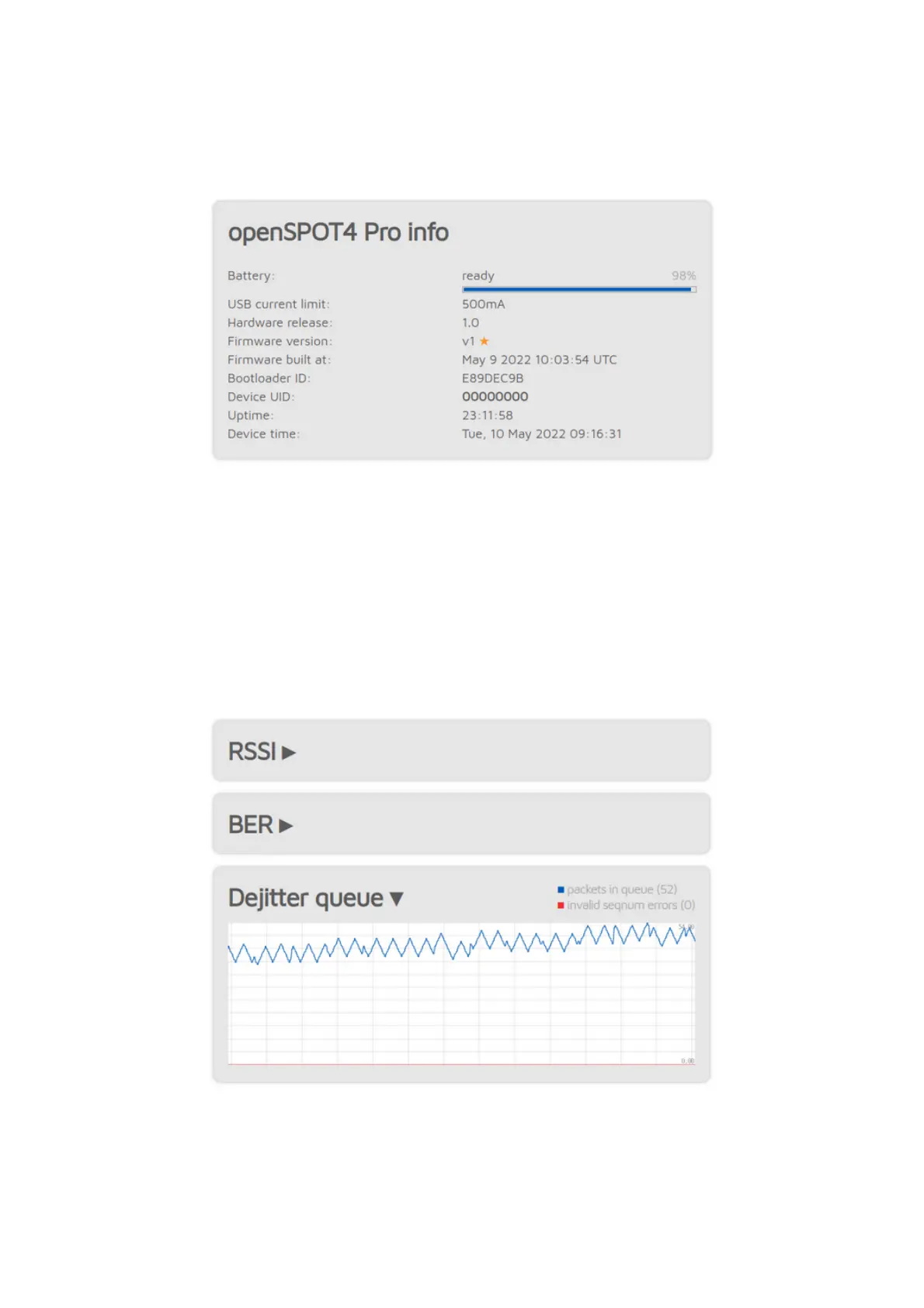 The RSSI graph shows receive signal strength from the modem. The BER graph