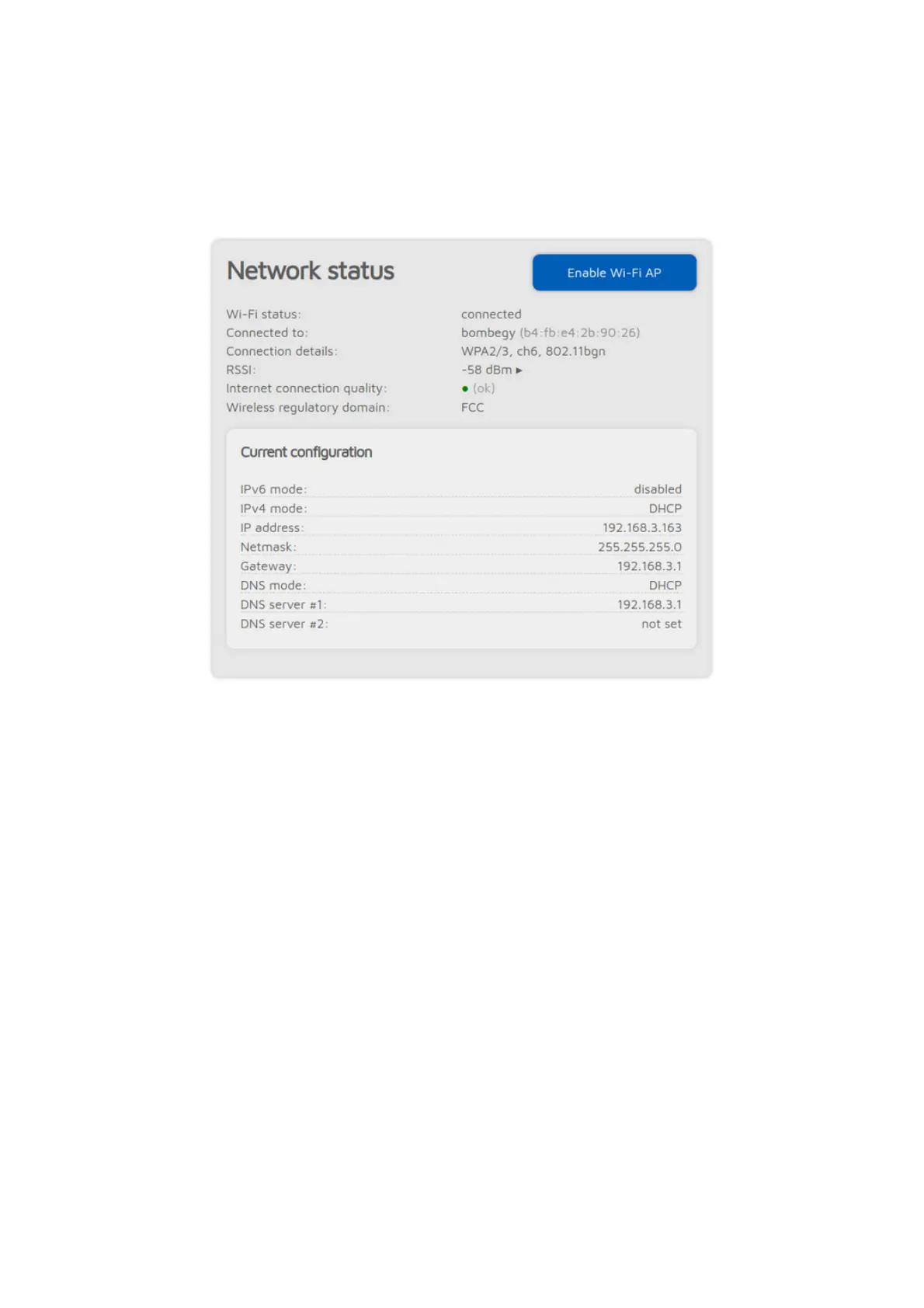 The Network status section shows current network status. The Wi-Fi RSSI