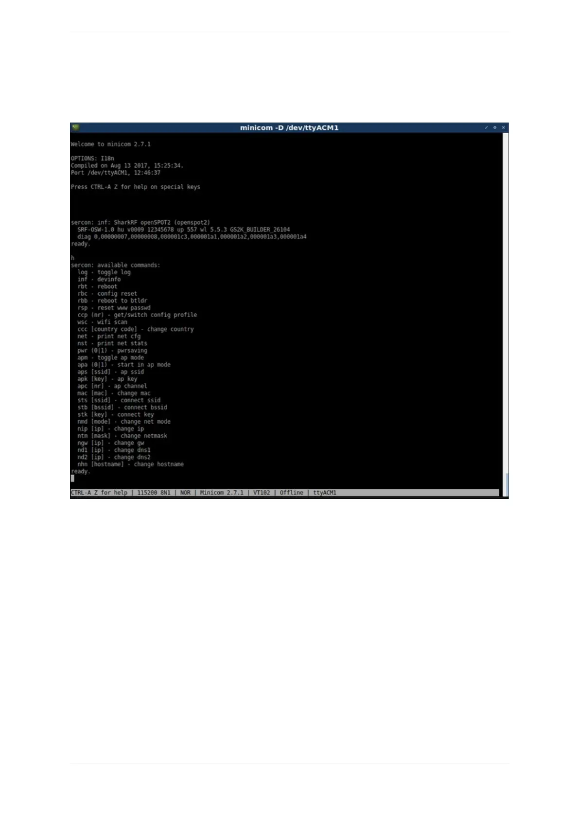 Theserialconsolecanbeusedtochangebasicnetworksettings,reboottheopenSPOT2,switchittobootloader