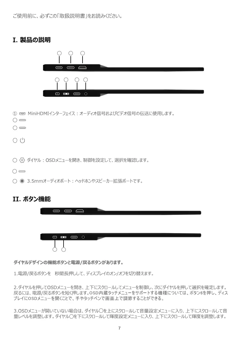 電源/復帰/信号スイッチ/画像回転ボタン︓ボタンを長押ししてディスプレイのオン/オフを切り替え、ボタン