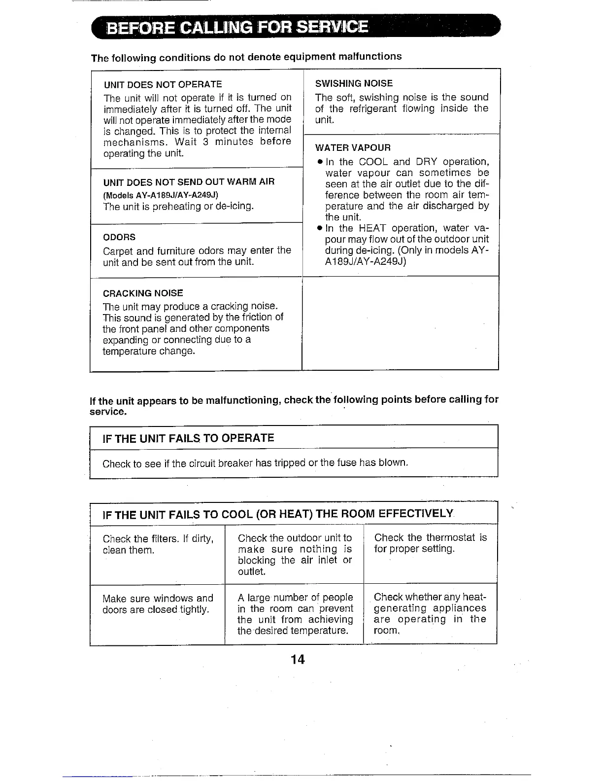 Sharp AE-A189J - Before Calling for Service; Unit Does Not Operate; Swishing Noise; Odors