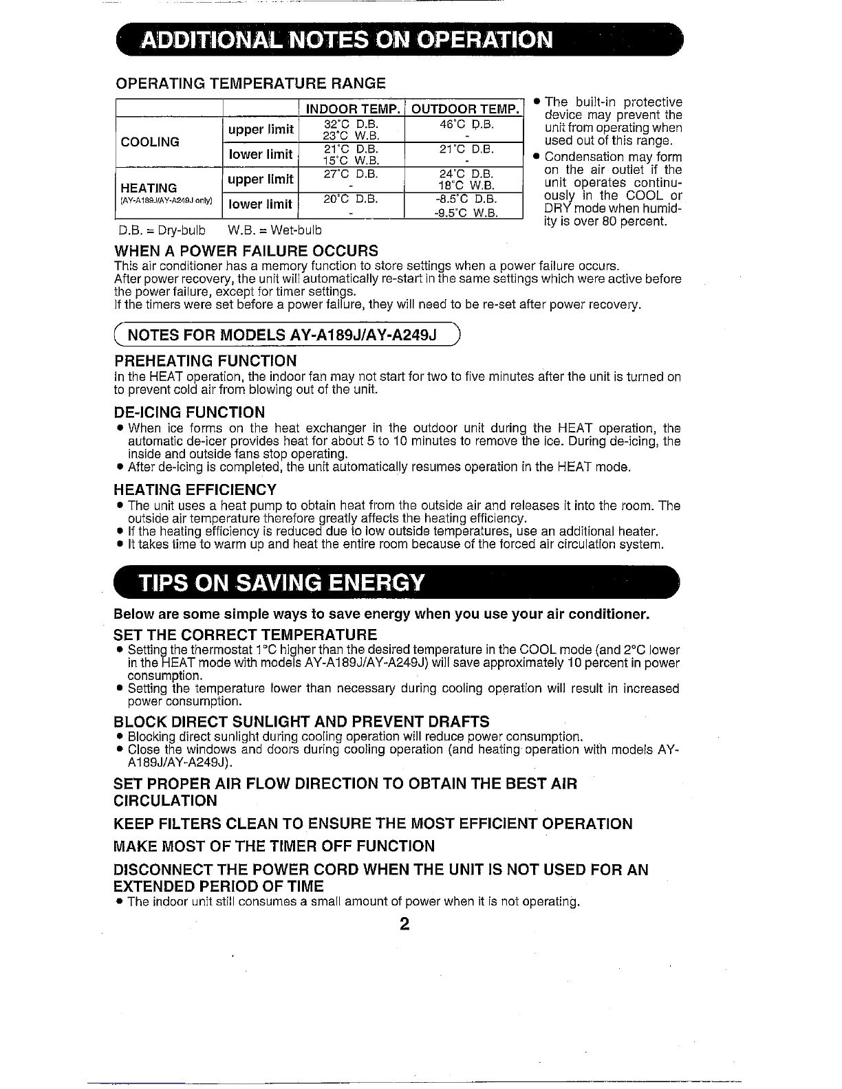 Sharp AE-A189J - Additional Notes on Operation; Operating Temperature Range; Tips on Saving Energy; Preheating Function