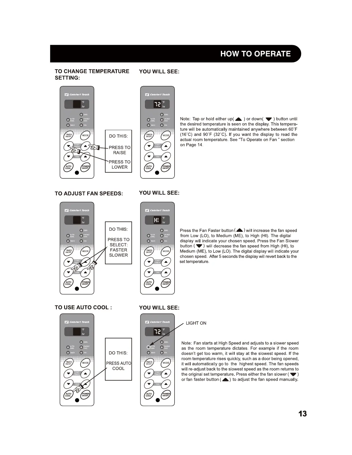 Sharp AF-S60PX - To Change Temperature Setting; To Adjust Fan Speeds; To Use Auto Cool