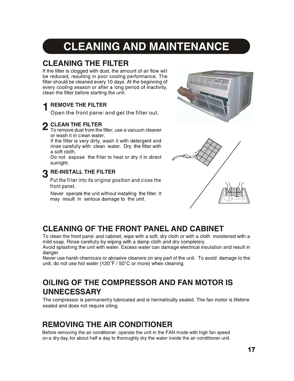 Sharp AF-S60PX - Cleaning and Maintenance; Cleaning the Filter; Cleaning of the Front Panel and Cabinet; Removing the Air Conditioner
