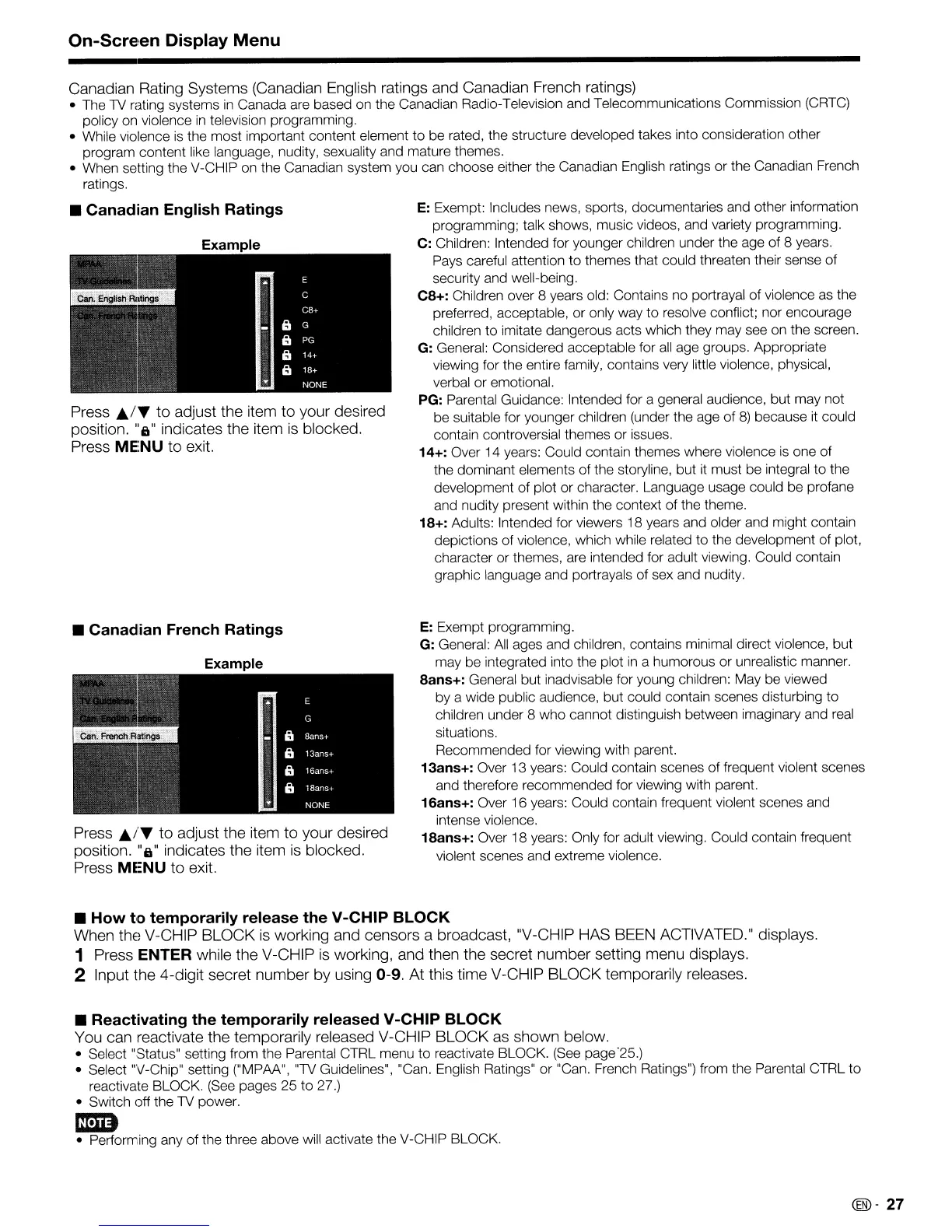 • When setting the V-CHIP on the Canadian system you can choose either the Canadian English ratings or the Canadian French