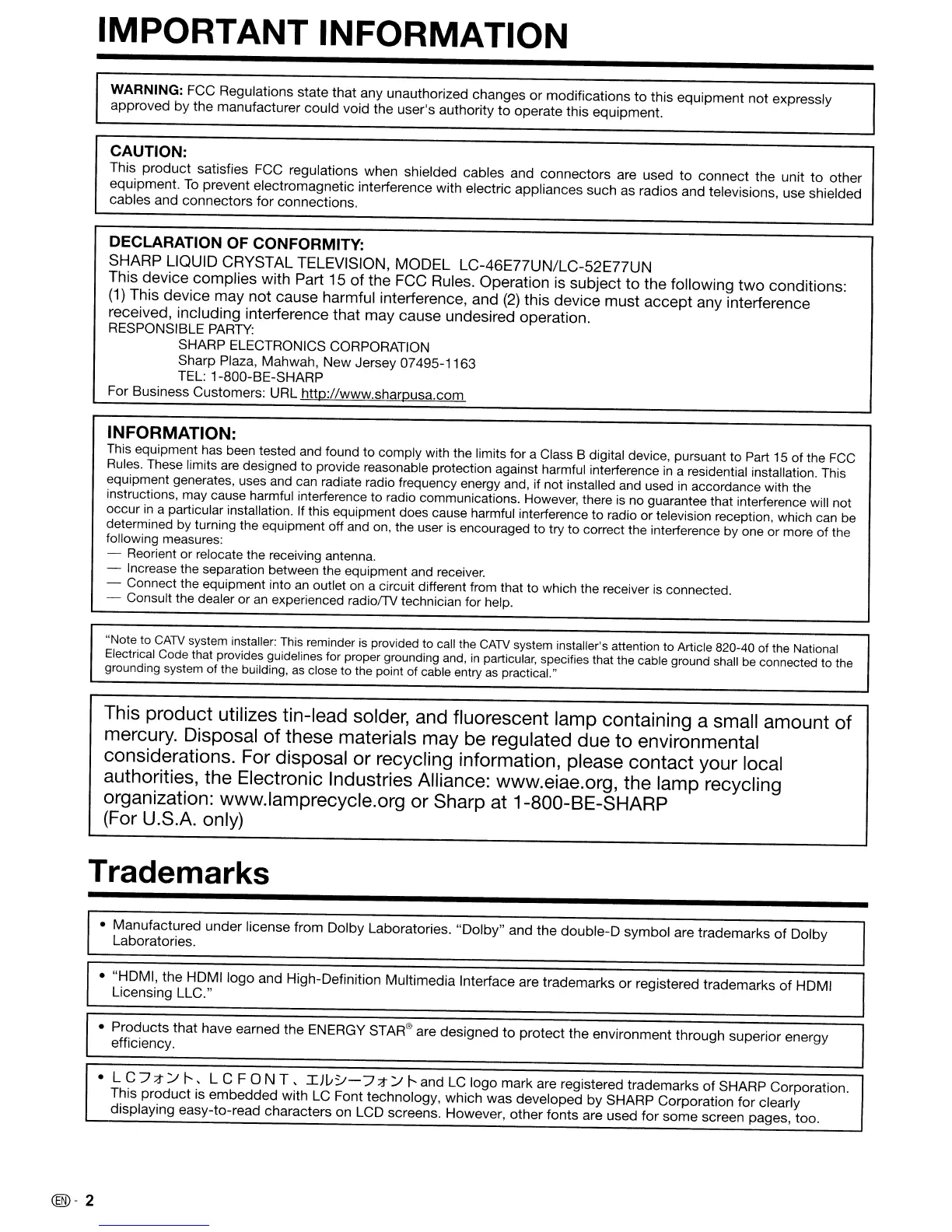 SHARP LIQUID CRYSTAL TELEVISION, MODEL LC-46E77UN/LC-52E77UN