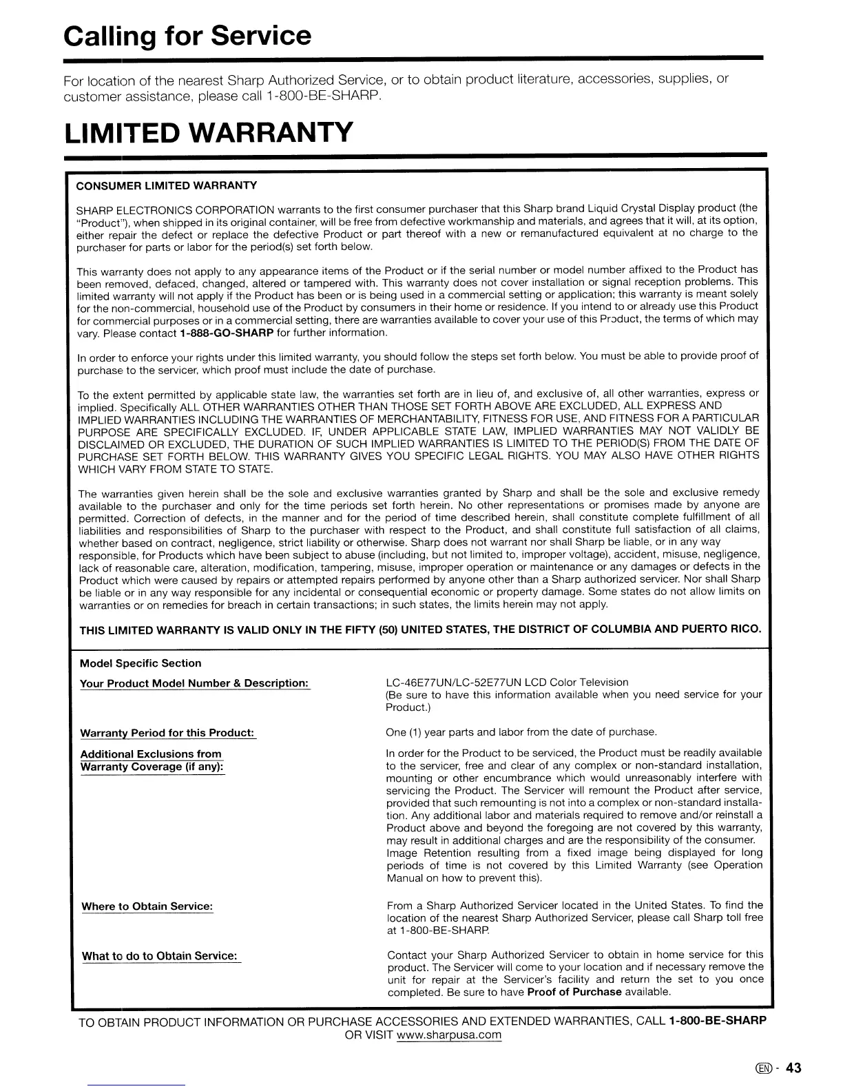 LC-46E77UN/LC-52E77UN LCD Color Television