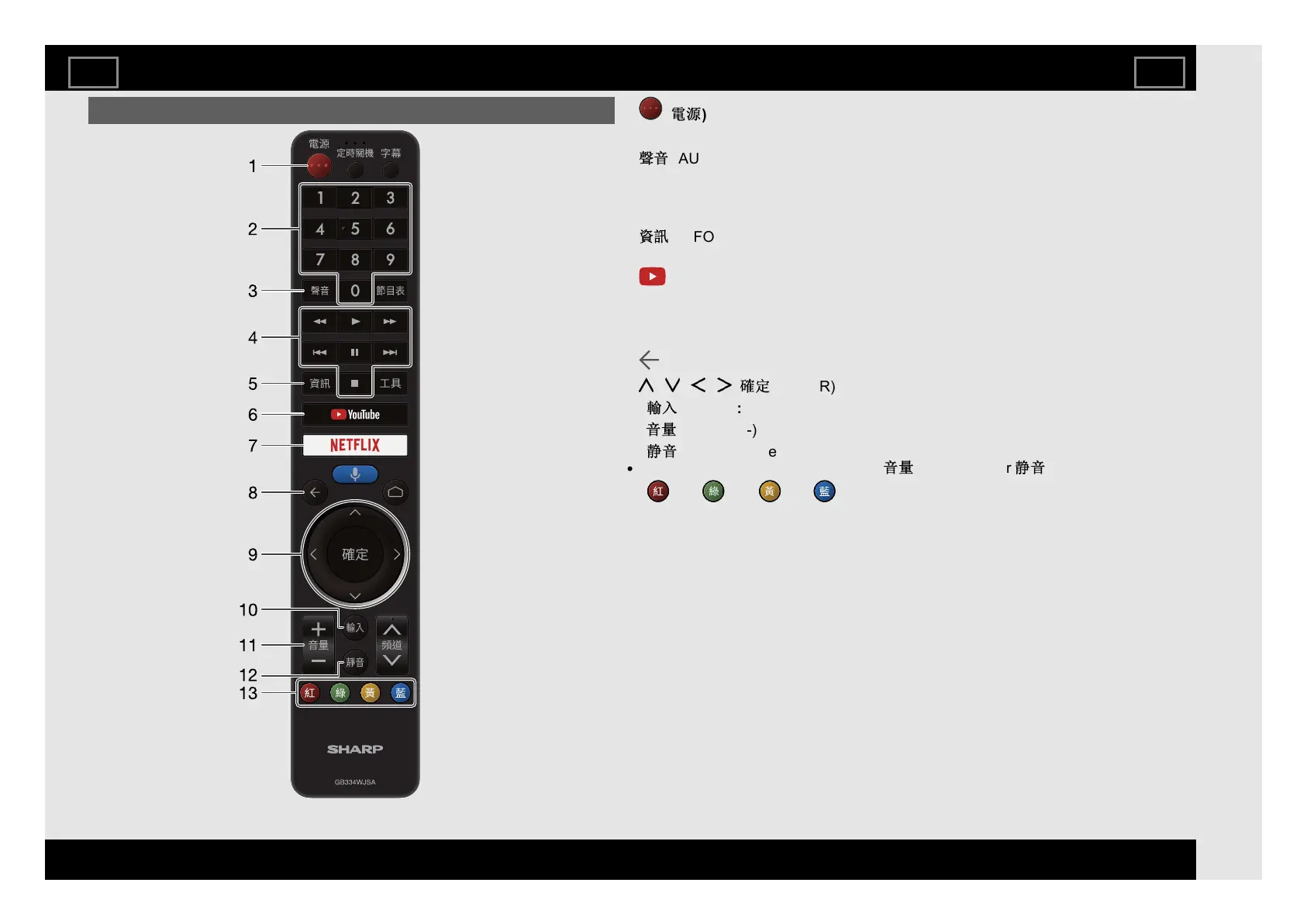 13 (R), (G), (Y), (B): The coloured buttons are