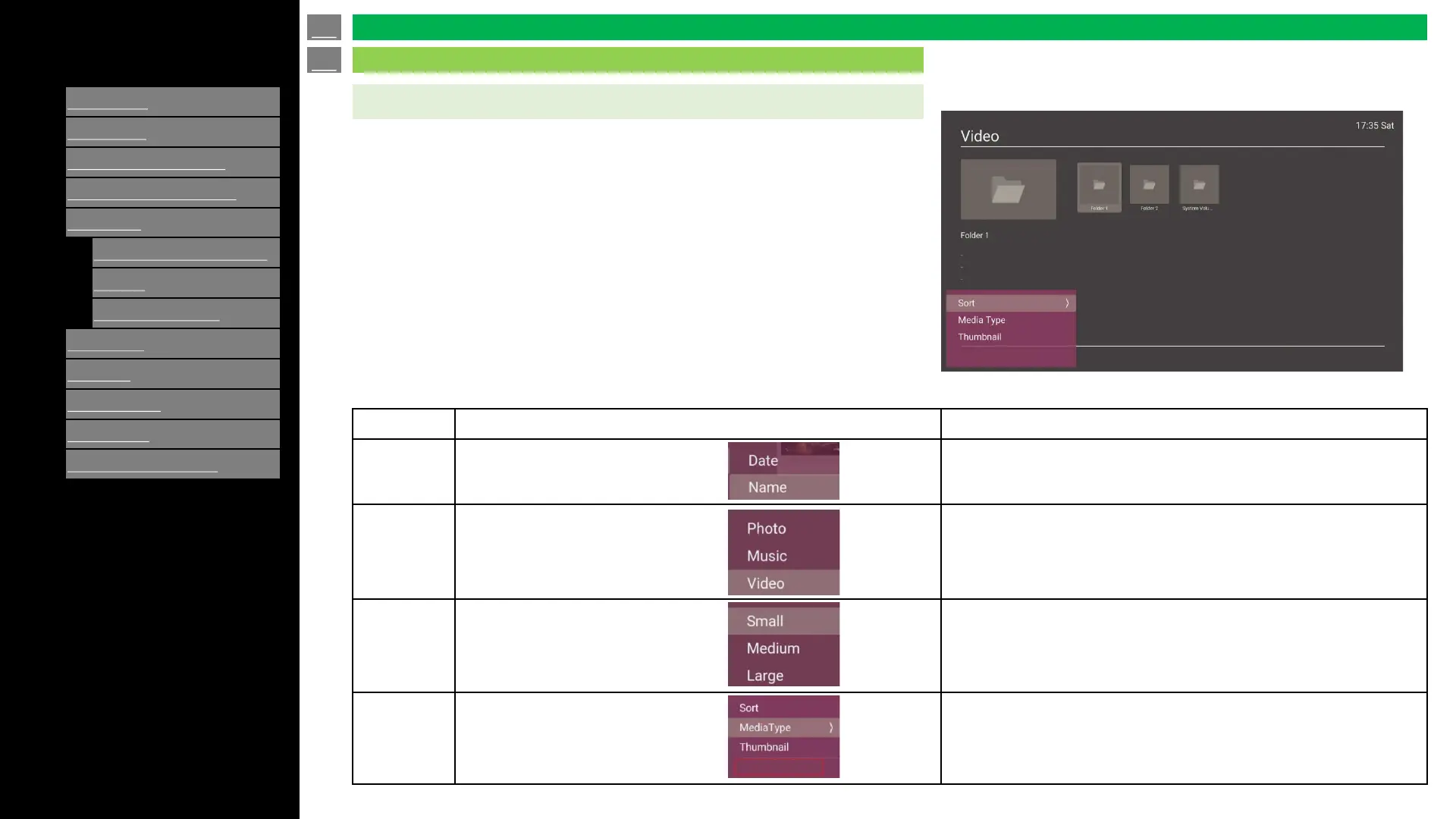 Thumbnail Small/Medium/Large Change the size of folder icon and video thumbnail.