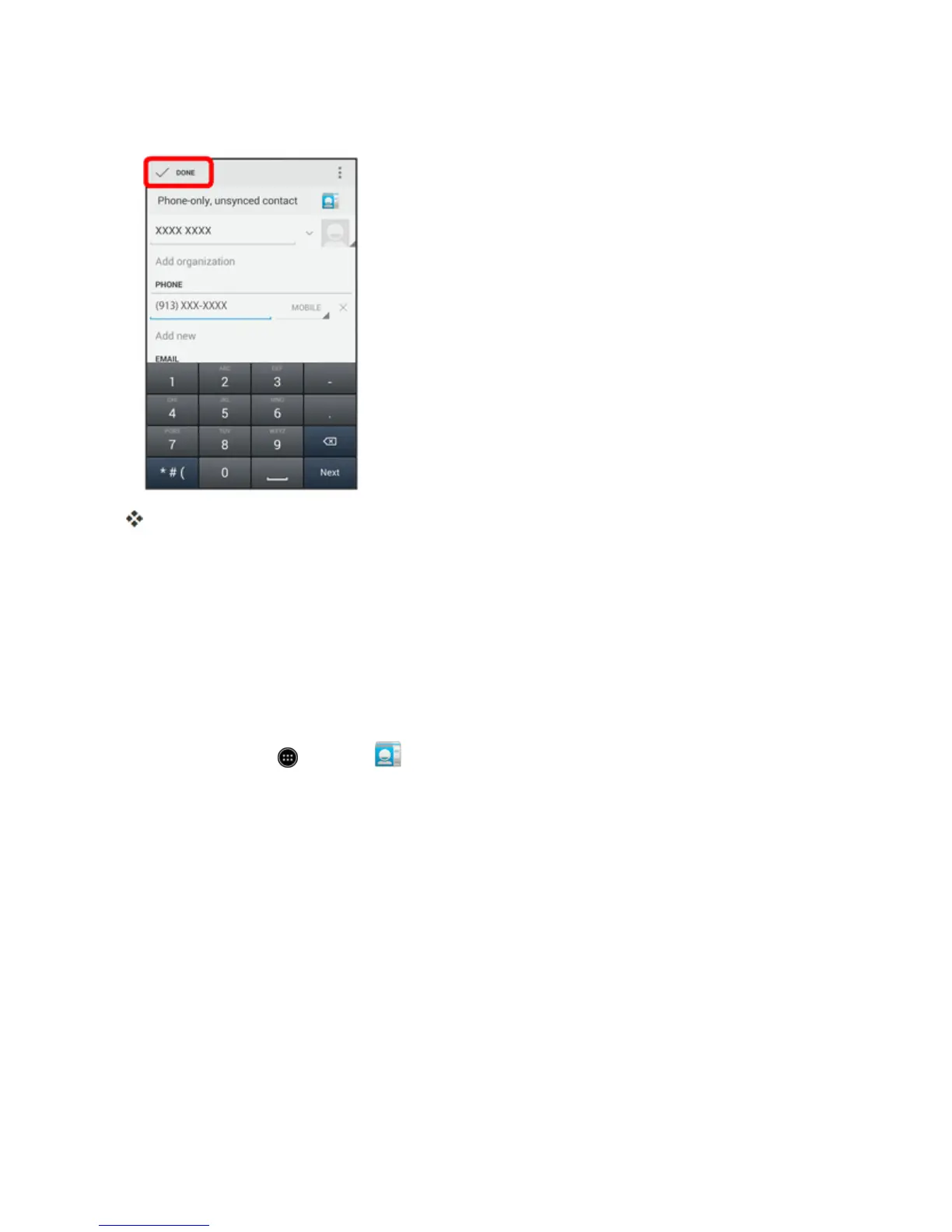 Note:Toaddmorephonenumbers,emailaddresses,etc.,touchAdd newdisplayedunderthe