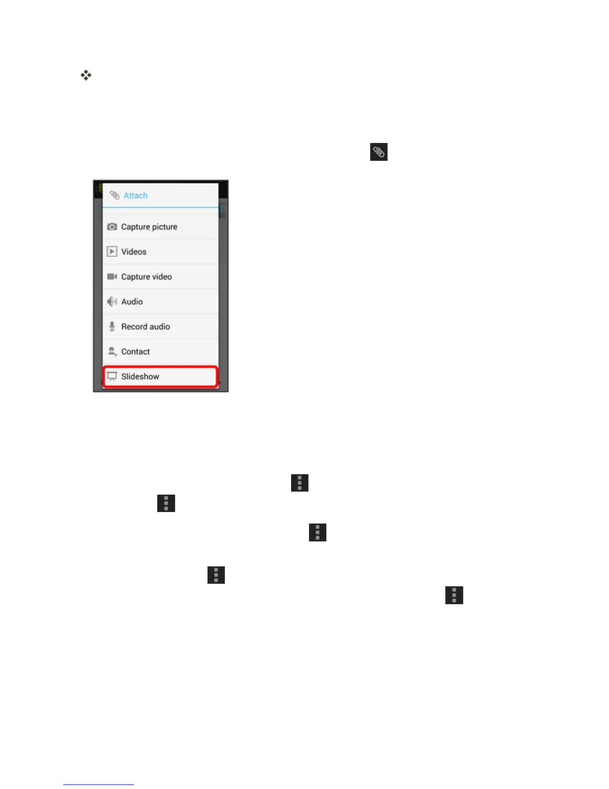 Inthemultimediamessageyou’recomposing,touchAttach >Slideshow.