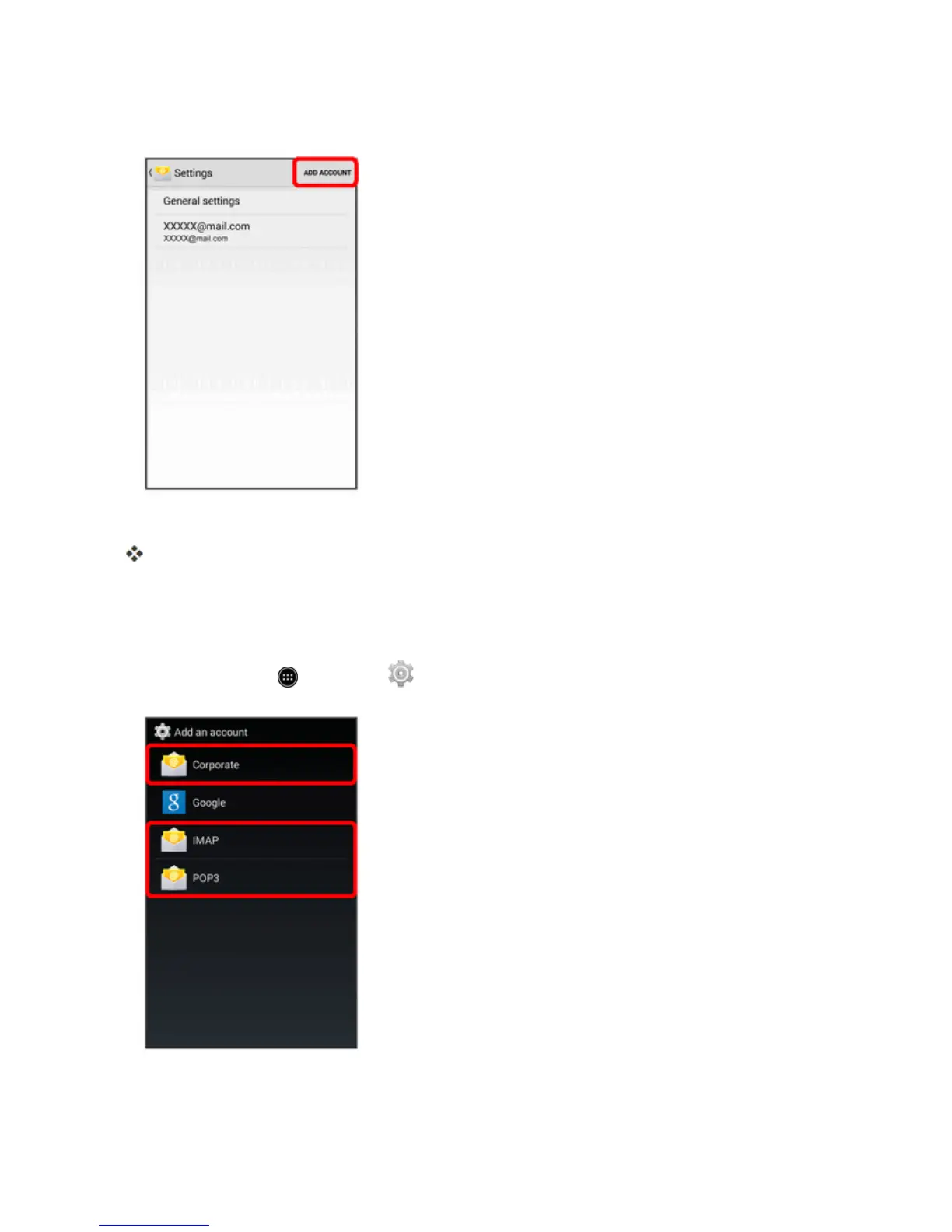 Fromhome,touch >Settings >Add account>Corporate,IMAP,orPOP3.