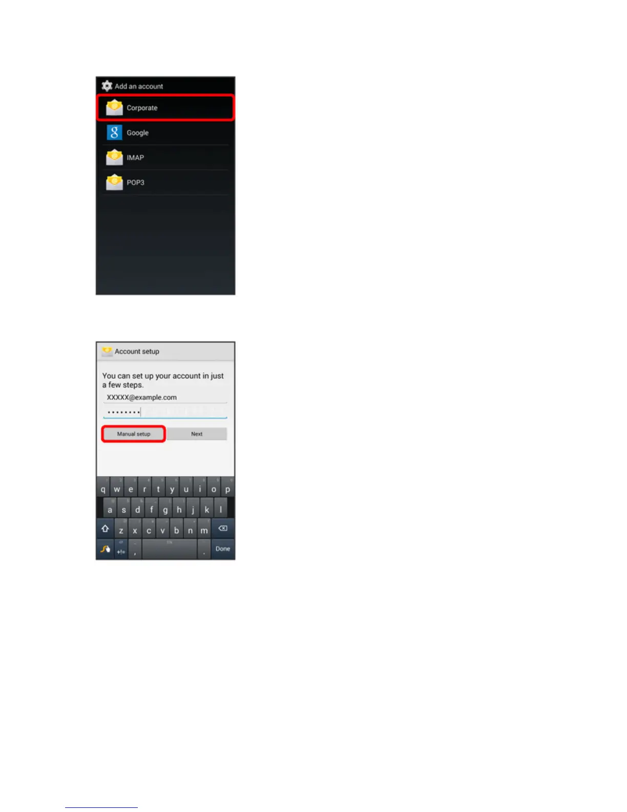 2. EntertheEmailaddressandPasswordfortheemailaccountandthentouchManual setup.