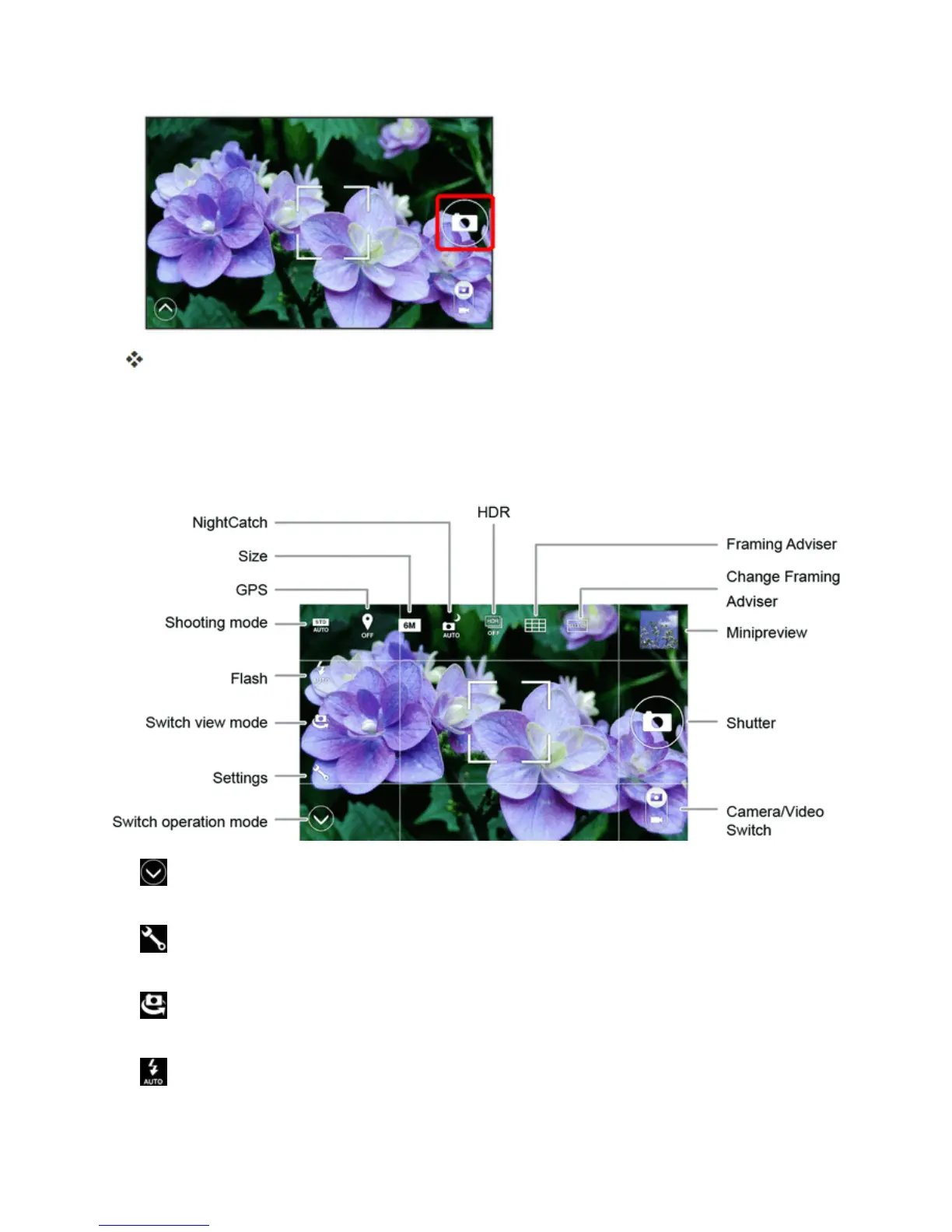 Switch view mode:Switchbetweenthebackcameralensandthefront-facingcamera