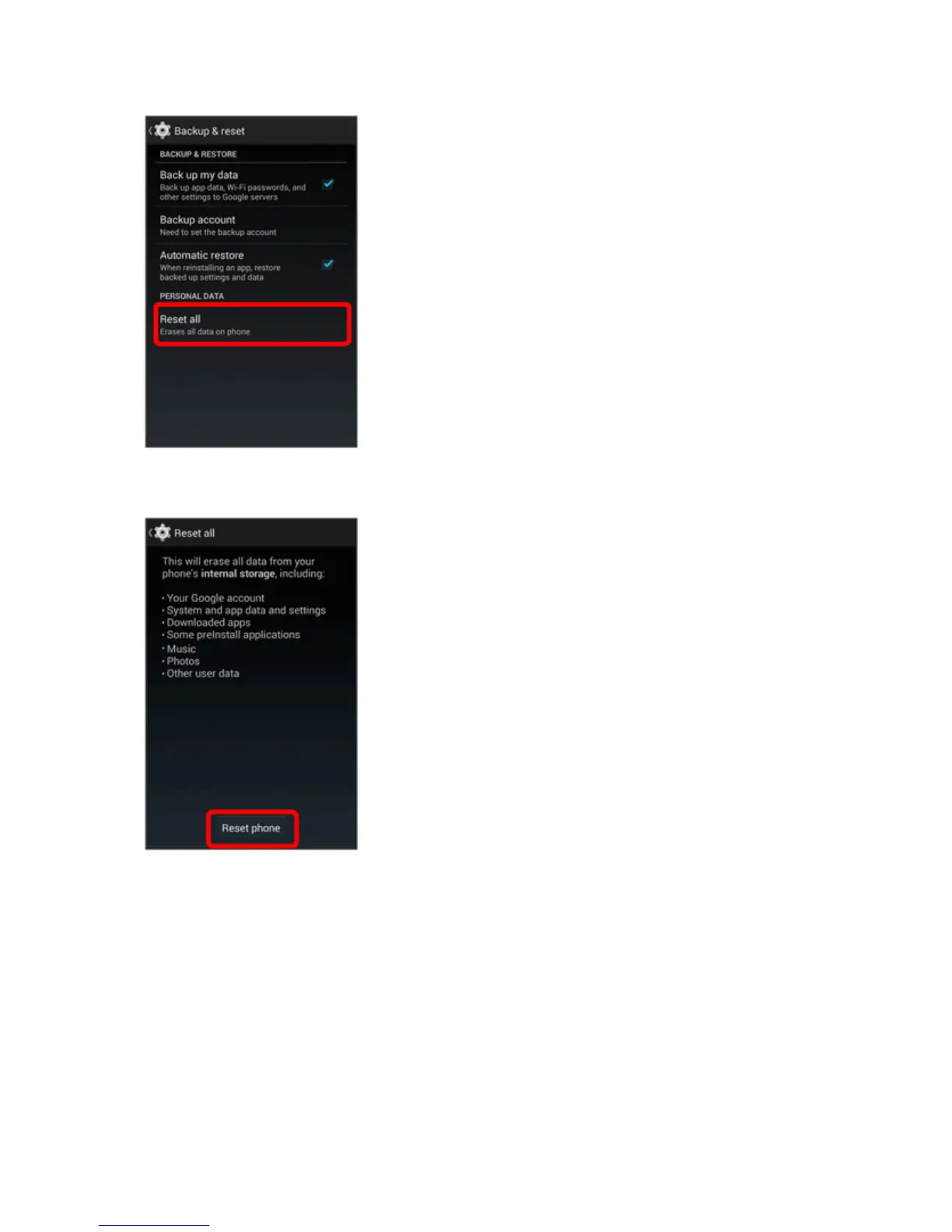 2. ReadtheresetallinformationpageandtouchReset phone.