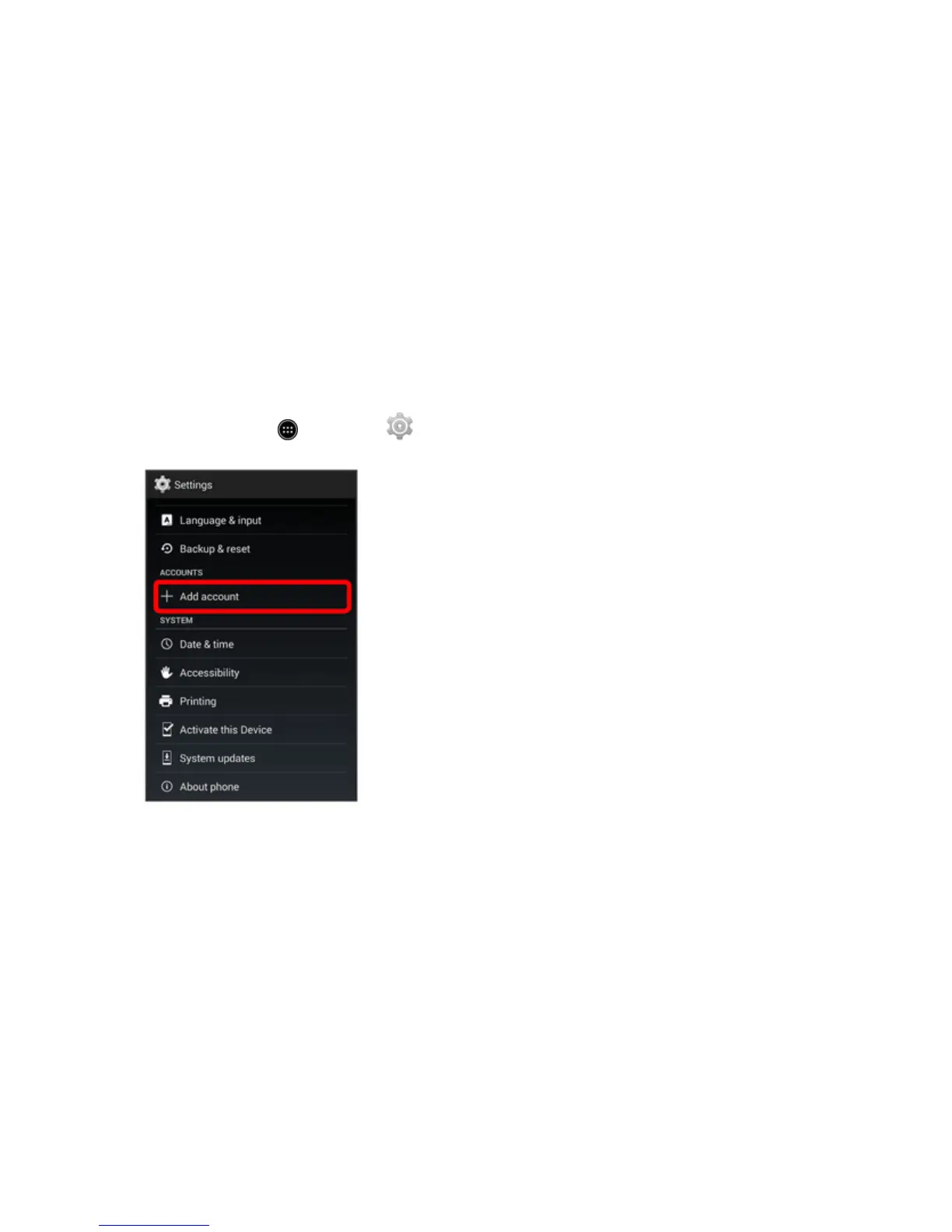 Fromhome,touch >Settings >Add account.