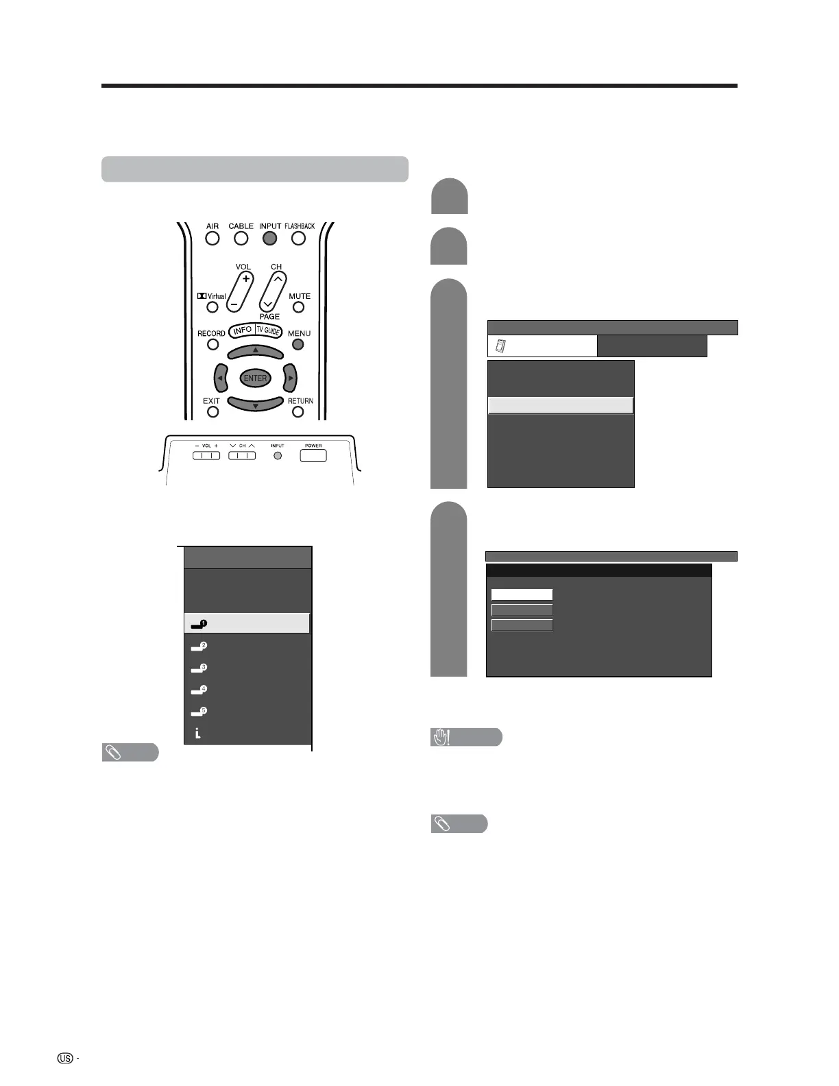 INPUT on the remote control unit or on the TV.