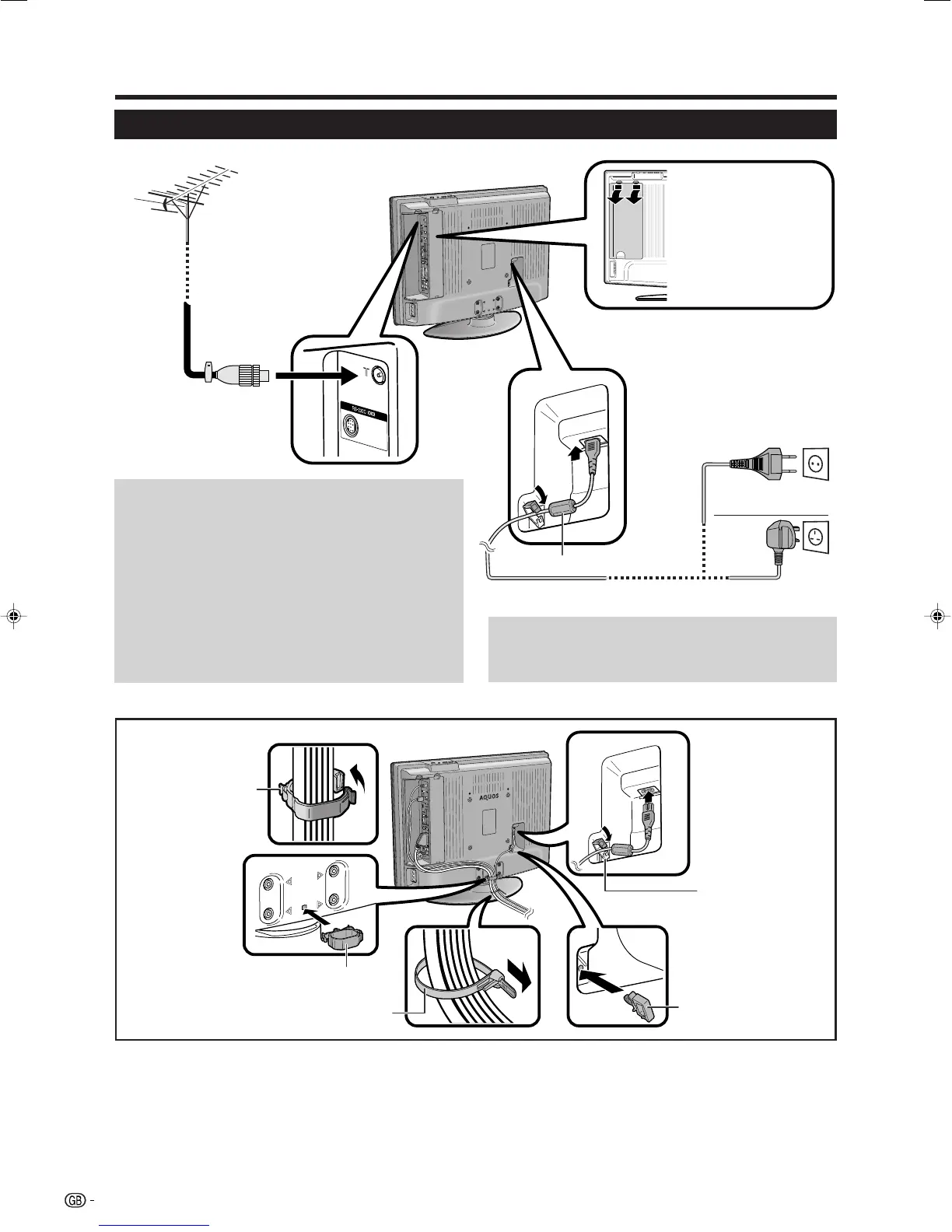 • This TV should be mounted on the wall only with the wall mount bracket available from SHARP. (See page 35.) The