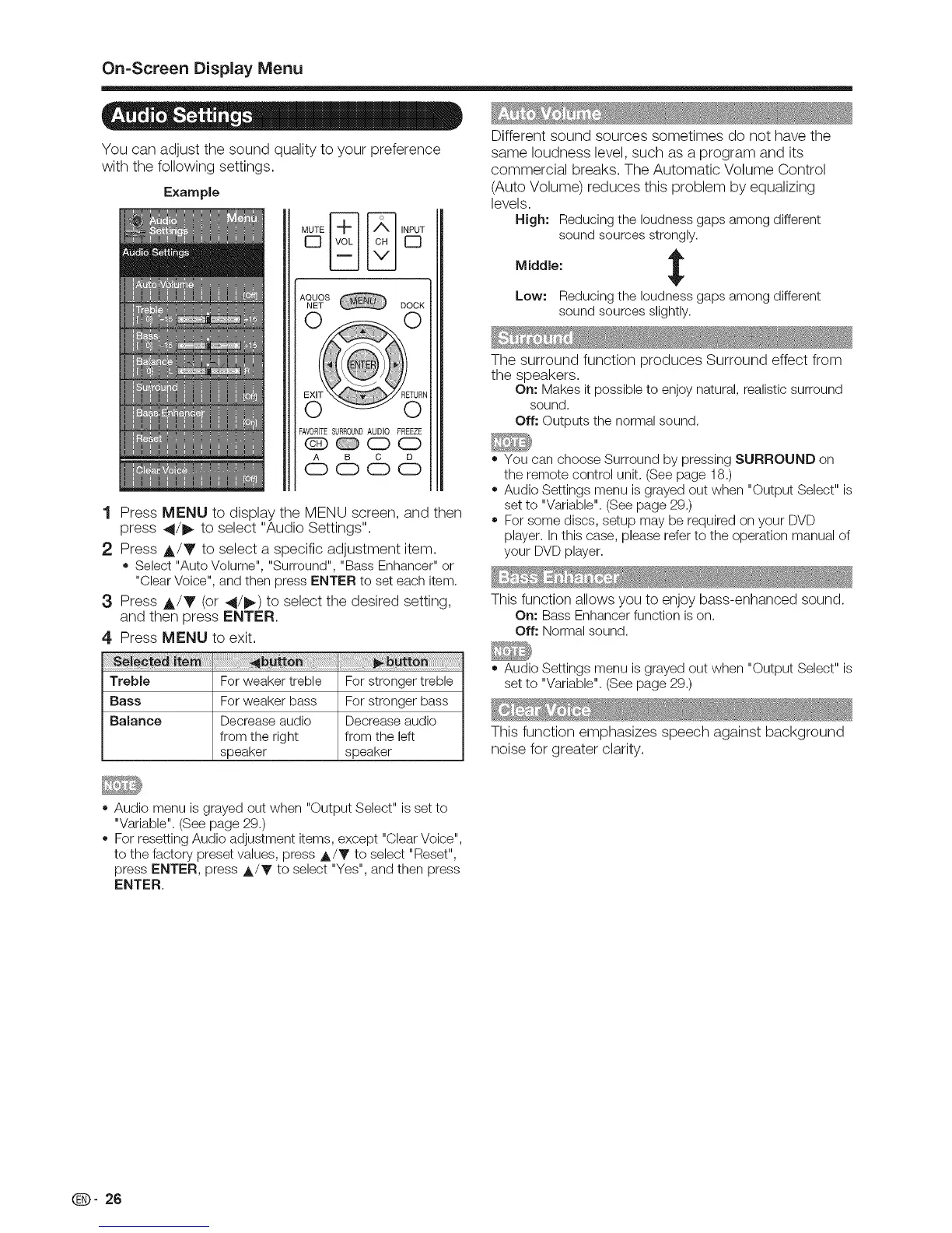 o Select "Auto Volume", "Surround", "Bass Enhancer" or