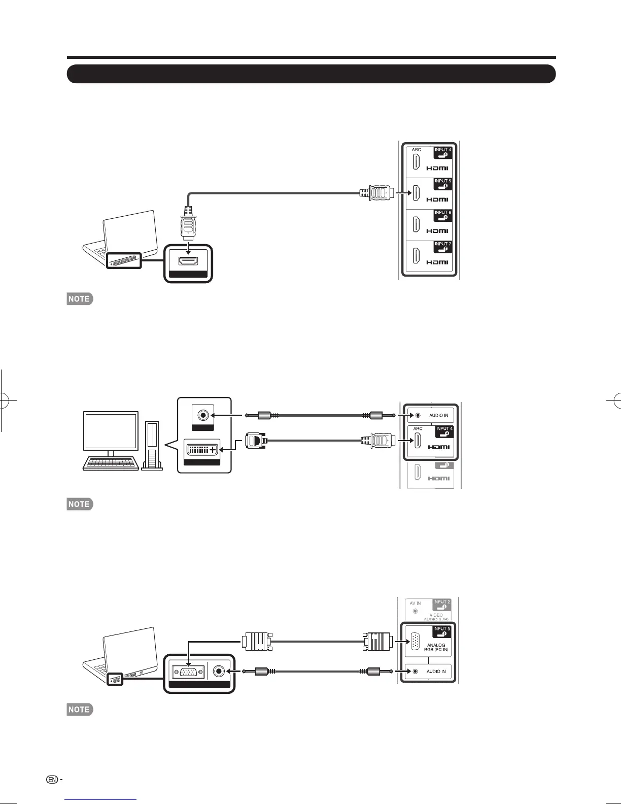 • When using a DVI-HDMI conversion cable, you should make an analog audio connection. In this case, in addition to
