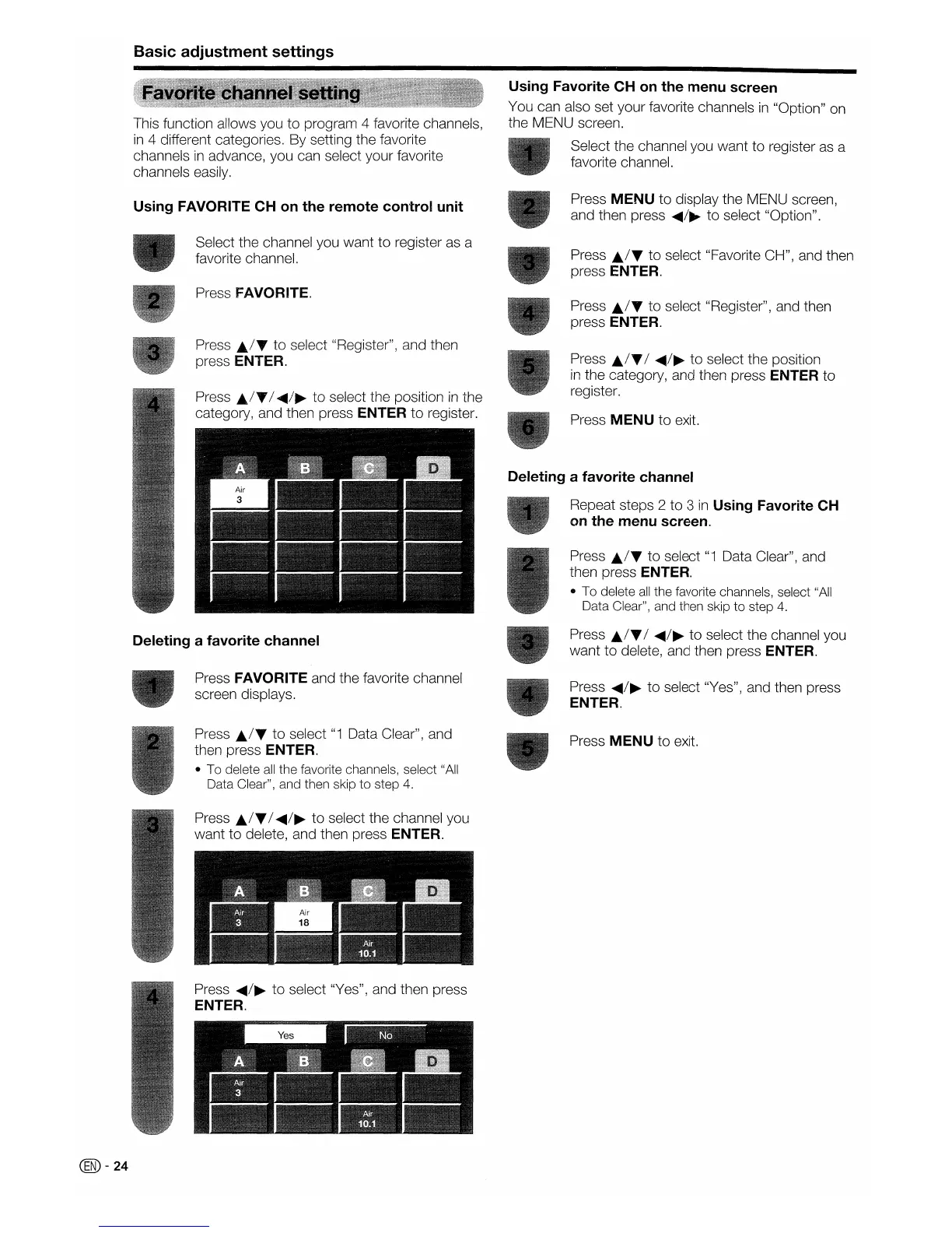 This function allows you to program 4 favorite channels,