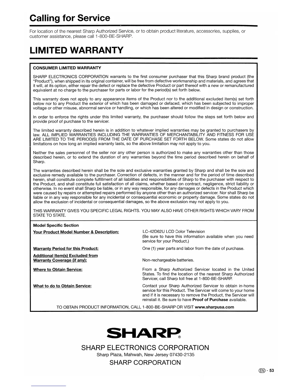 customer assistance, please call 1-800-BE-SHARP.