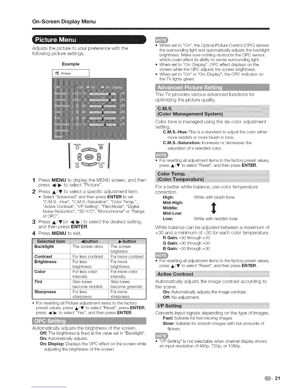 "C.M.S. -Hue", "C.M.S.-Saturation", "Color Temp.",