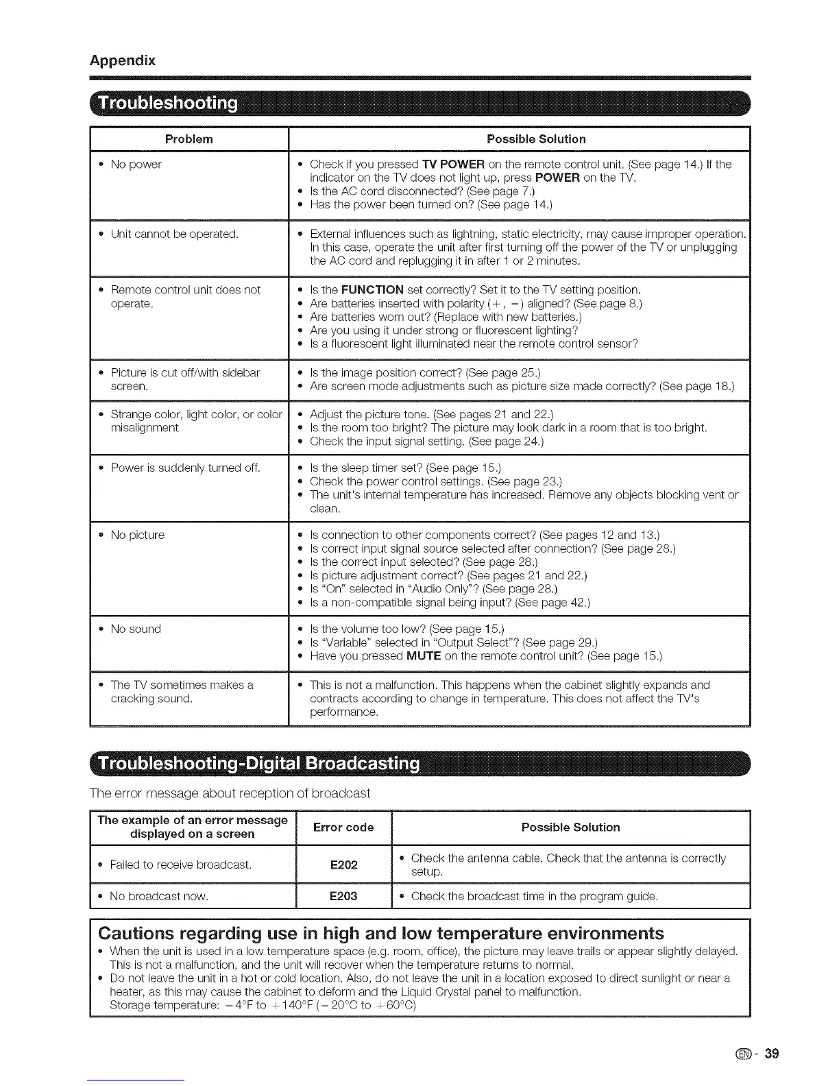 o No power o Check if you pressed "iV POWER on the remote control unit. (See page 14.) Ifthe