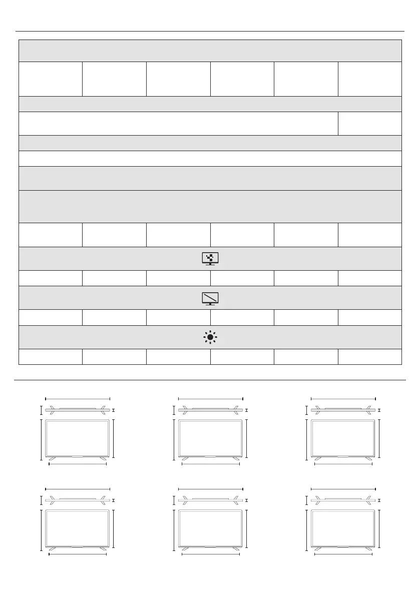 40" / 102cm 43" / 109cm 49" / 123cm 50" / 127cm 55" / 139cm 65" / 164cm