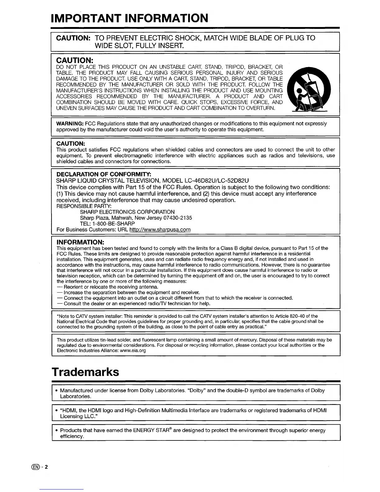 SHARP LIQUID CRYSTAL TELEVISION, MODEL LC-46D82U/LC-52D82U