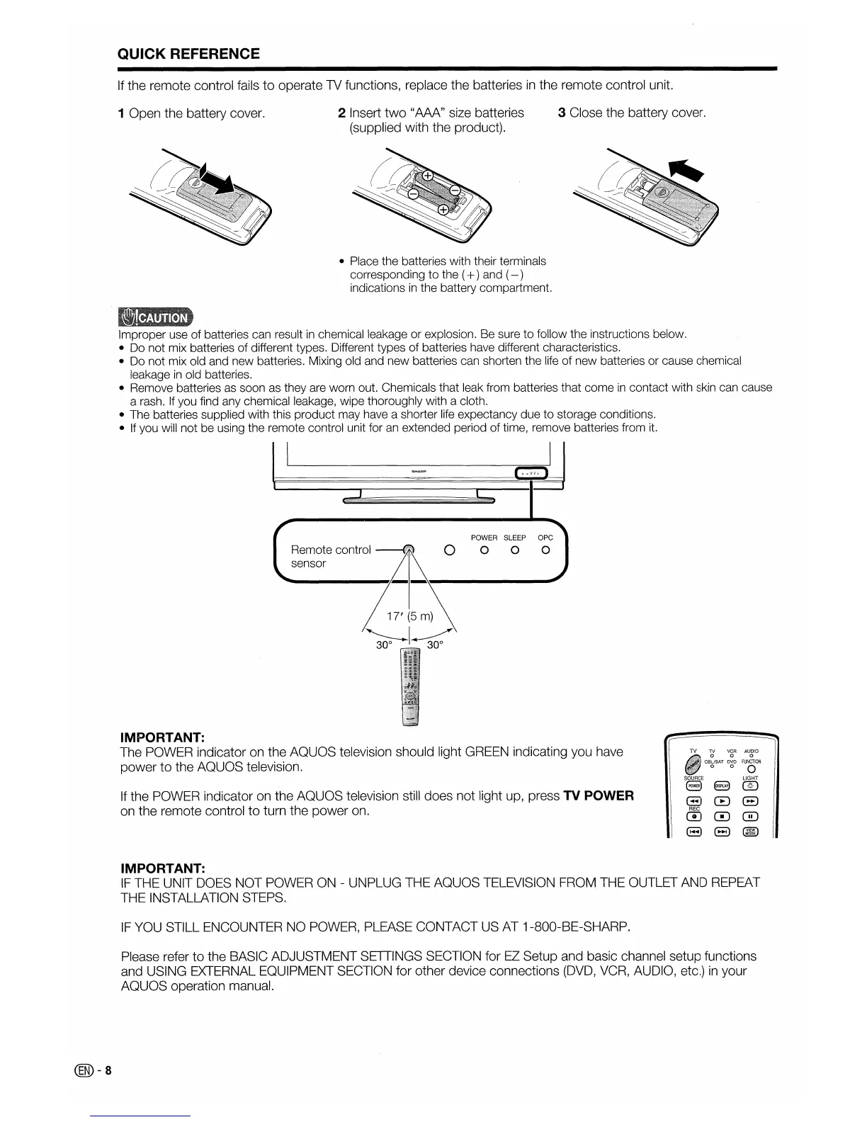 The POWER indicator on the AQUOS television should light GREEN indicating you have