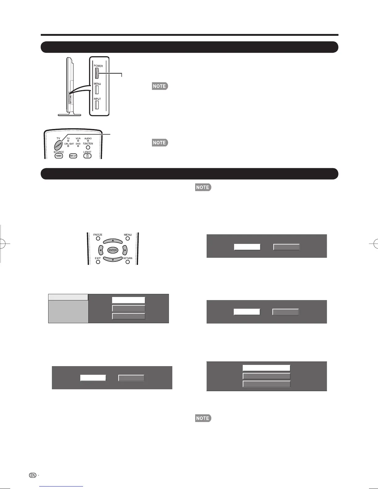 • The initial setup starts when the TV powers on for the fi rst time. If the TV has