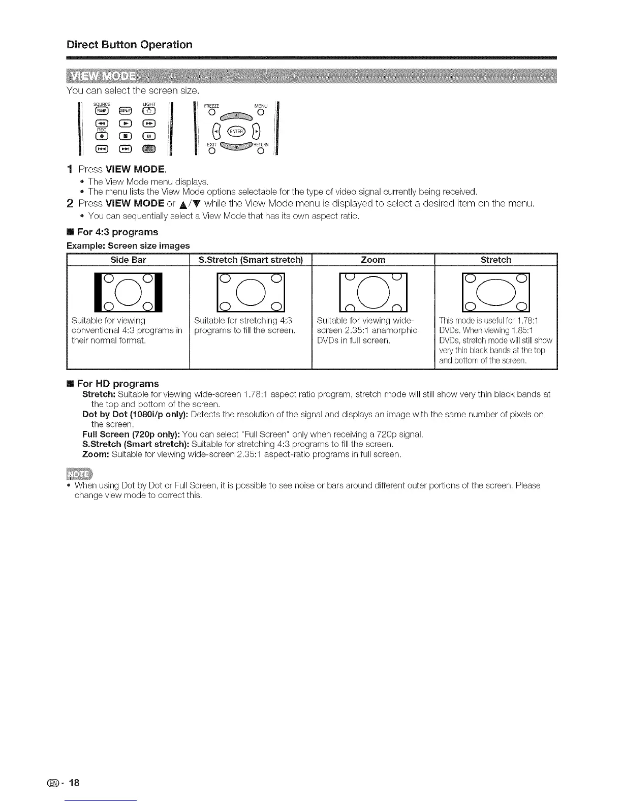 S.Stretch (Smart stretch}: Suitable for stretching 4:3 programs to fill the screen.