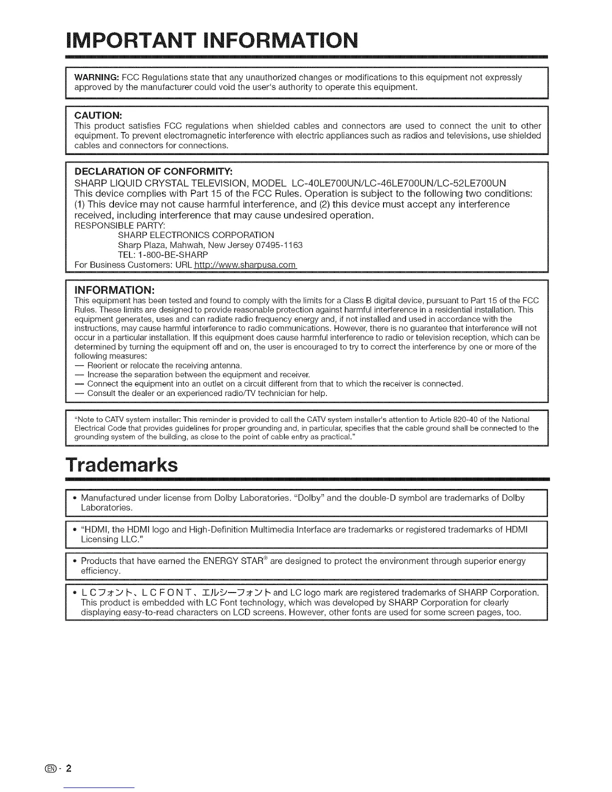 L C _ _ _ I_ , L C F O N T, _T_)L,'_--_ _ _' I" and LC logo mark are registered trademarks of SHARP Corporation.
