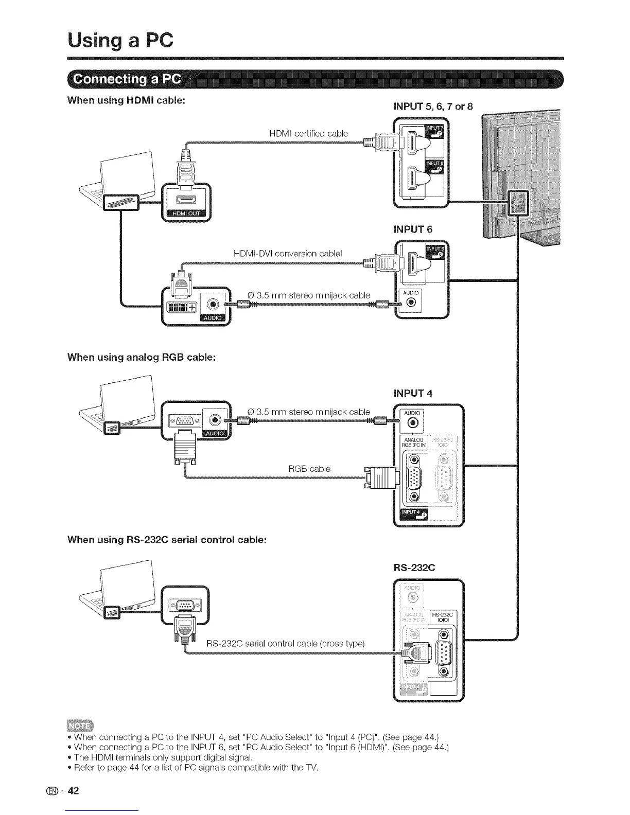 oWhen connecting a PC to the INPUT 6, set "PC Audio Select" to "Input 6 (HDMI)". (See page 44.)