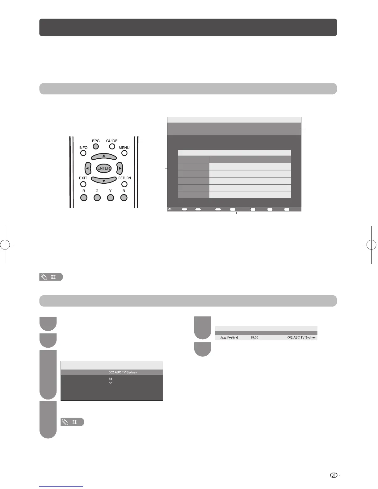 如果電視機正在接收數碼電視廣播信號,那麼當按下遙控器上 EPG(電子節目指南)按鈕時,電視畫面上