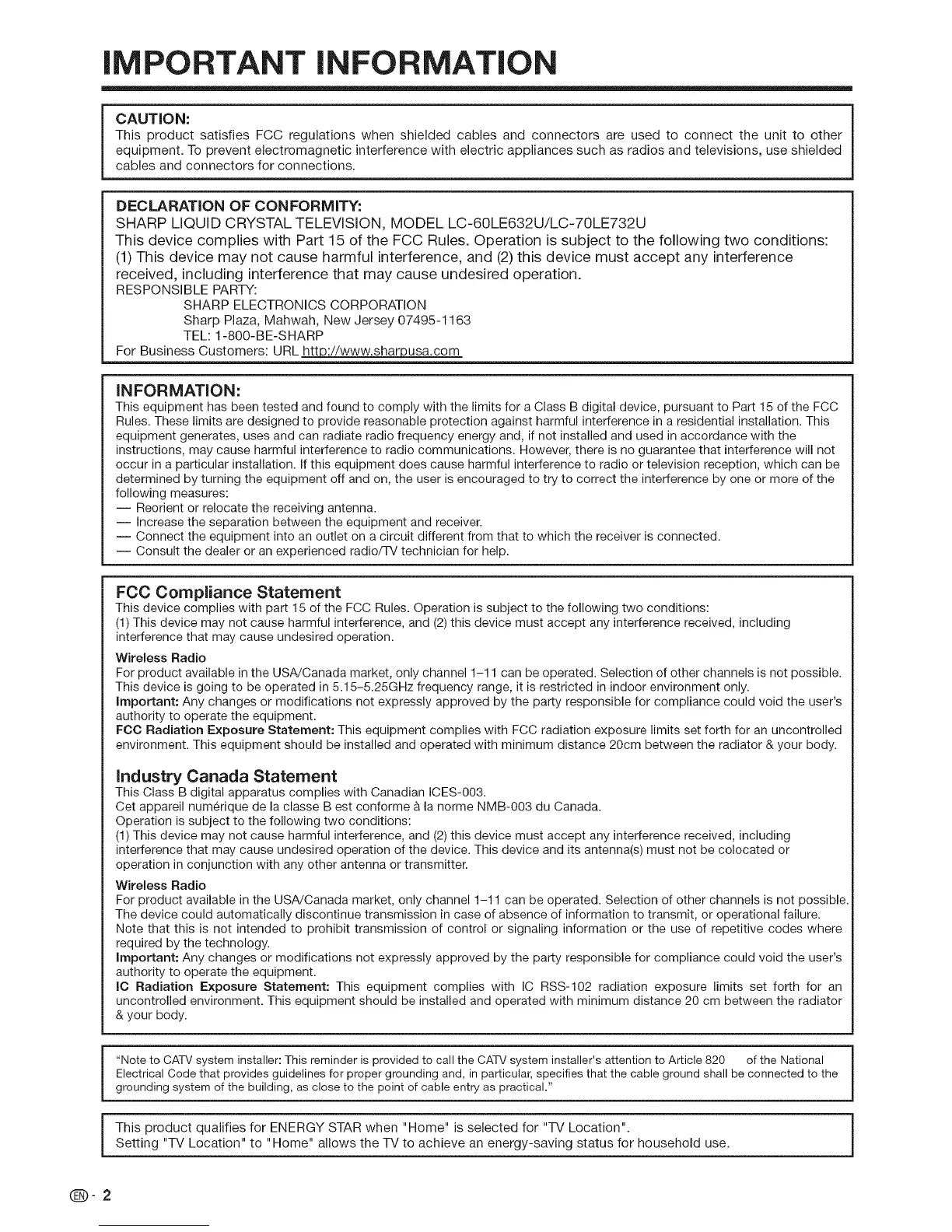 SHARP LiQUiD CRYSTAL TELEViSiON, MODEL LC-60LE632U/LC-70LE732U