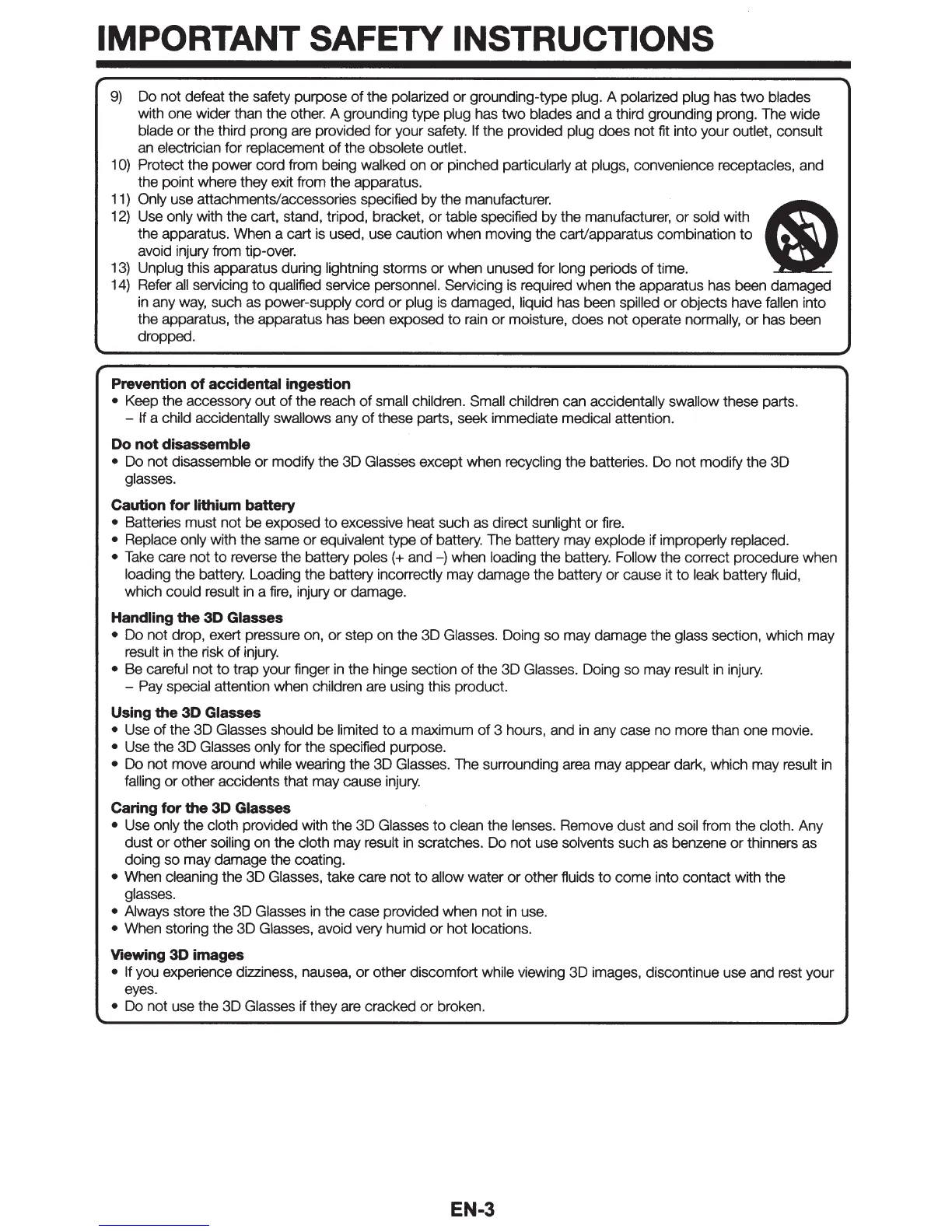step on the 3D Glasses. Doing so may damage the glass section, which may
