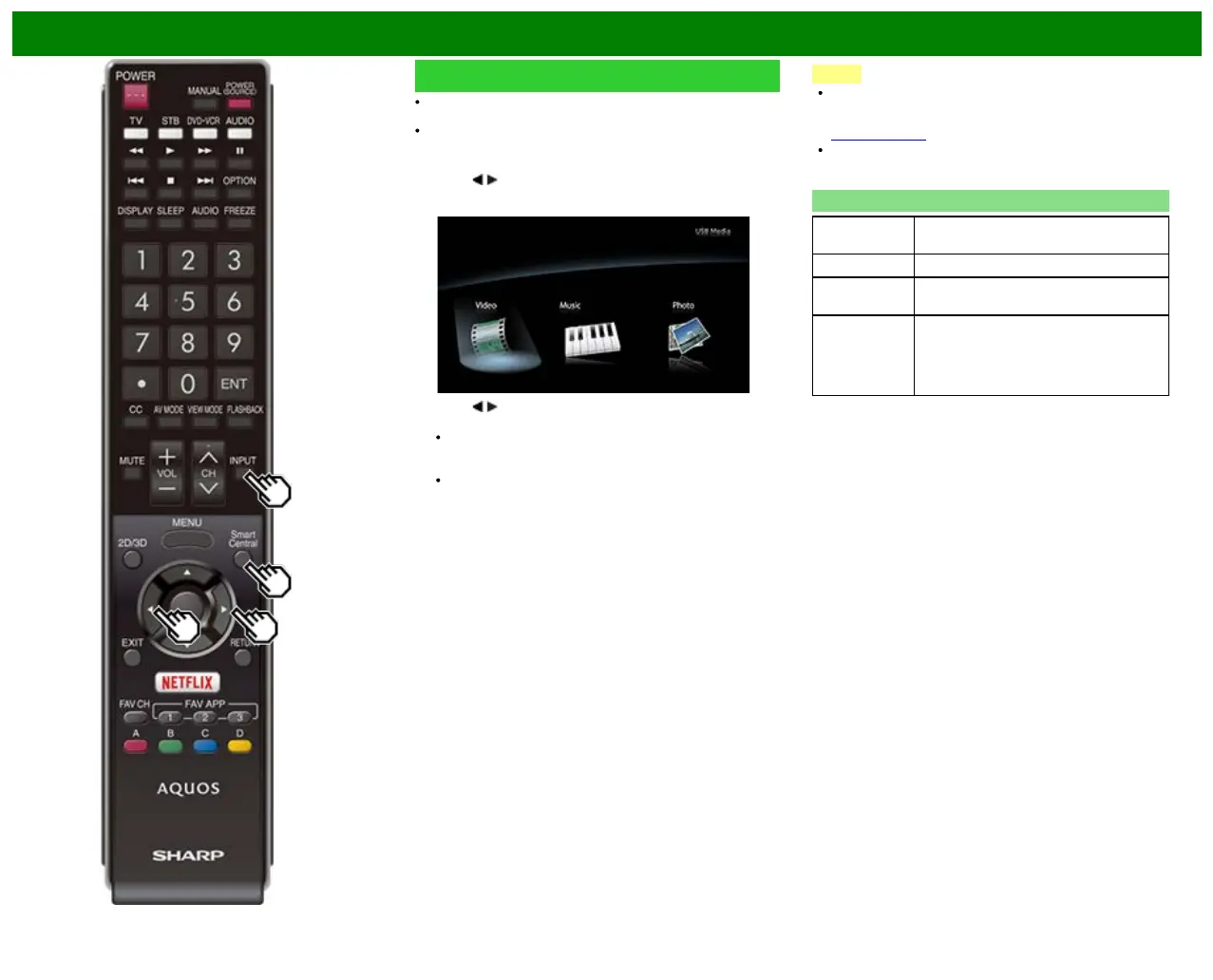 / to select "Photo", "Music" or "Video", and