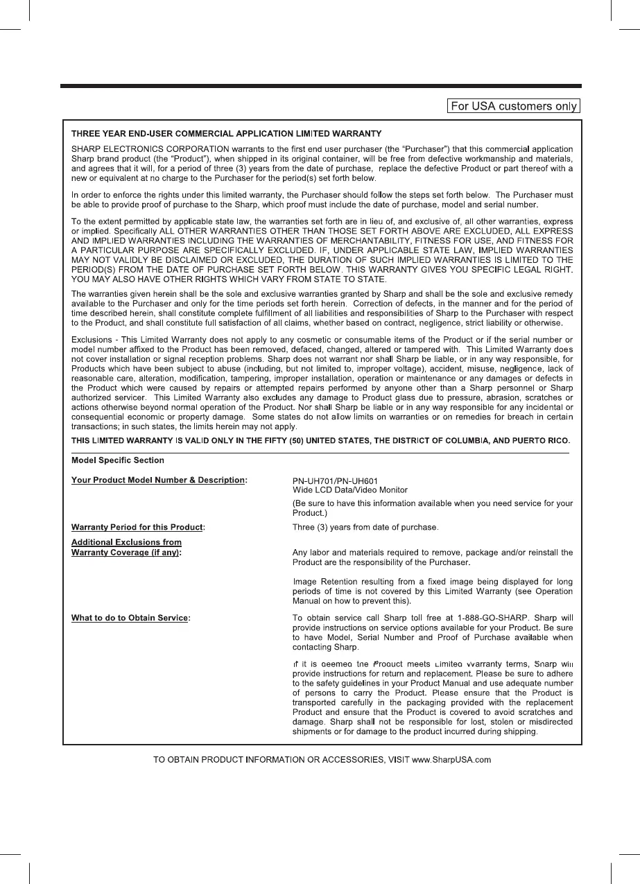 Sharp AQUOS PN-UH601 - Limited Warranty