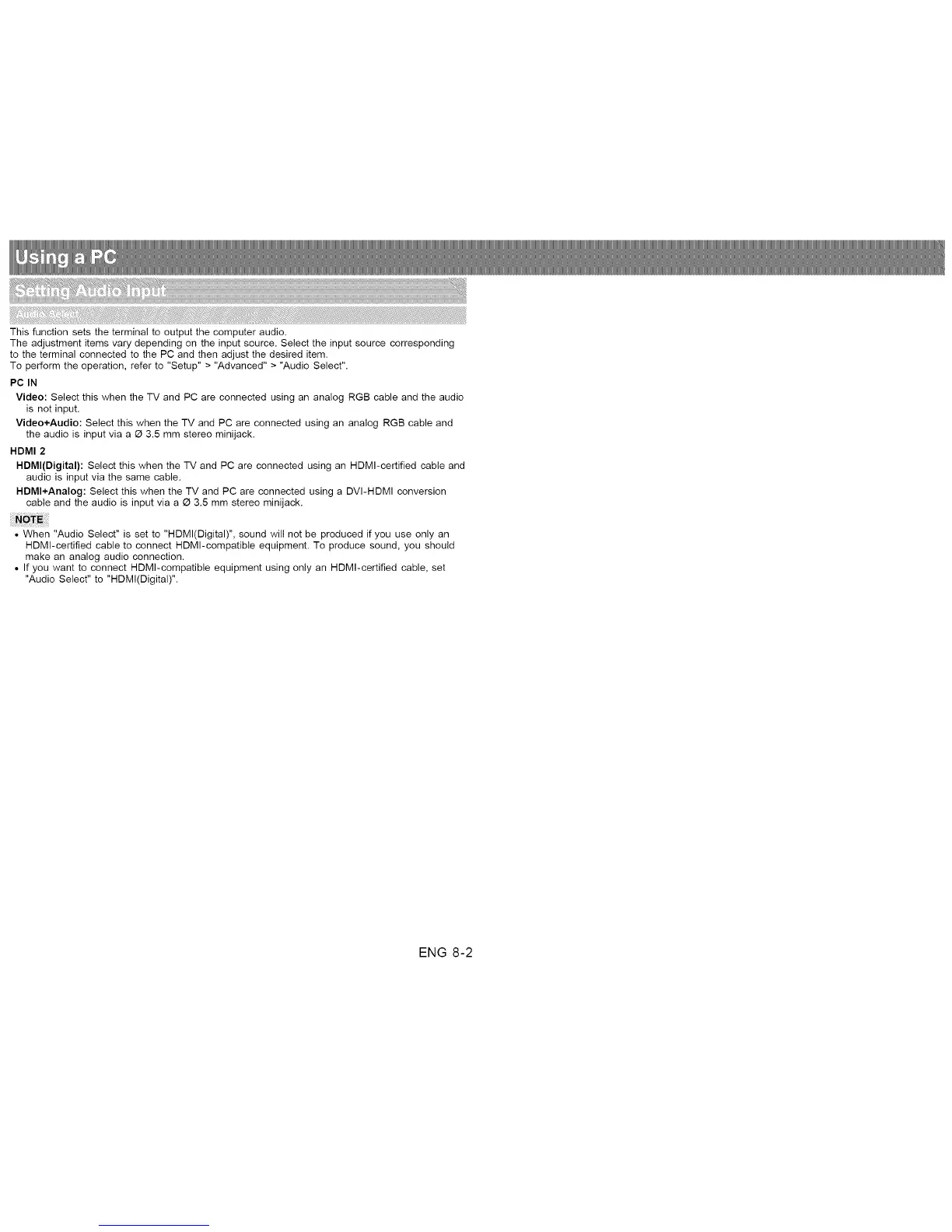 Video+Audio: Select this when the TV and PC are connected using an analog RGB cable and