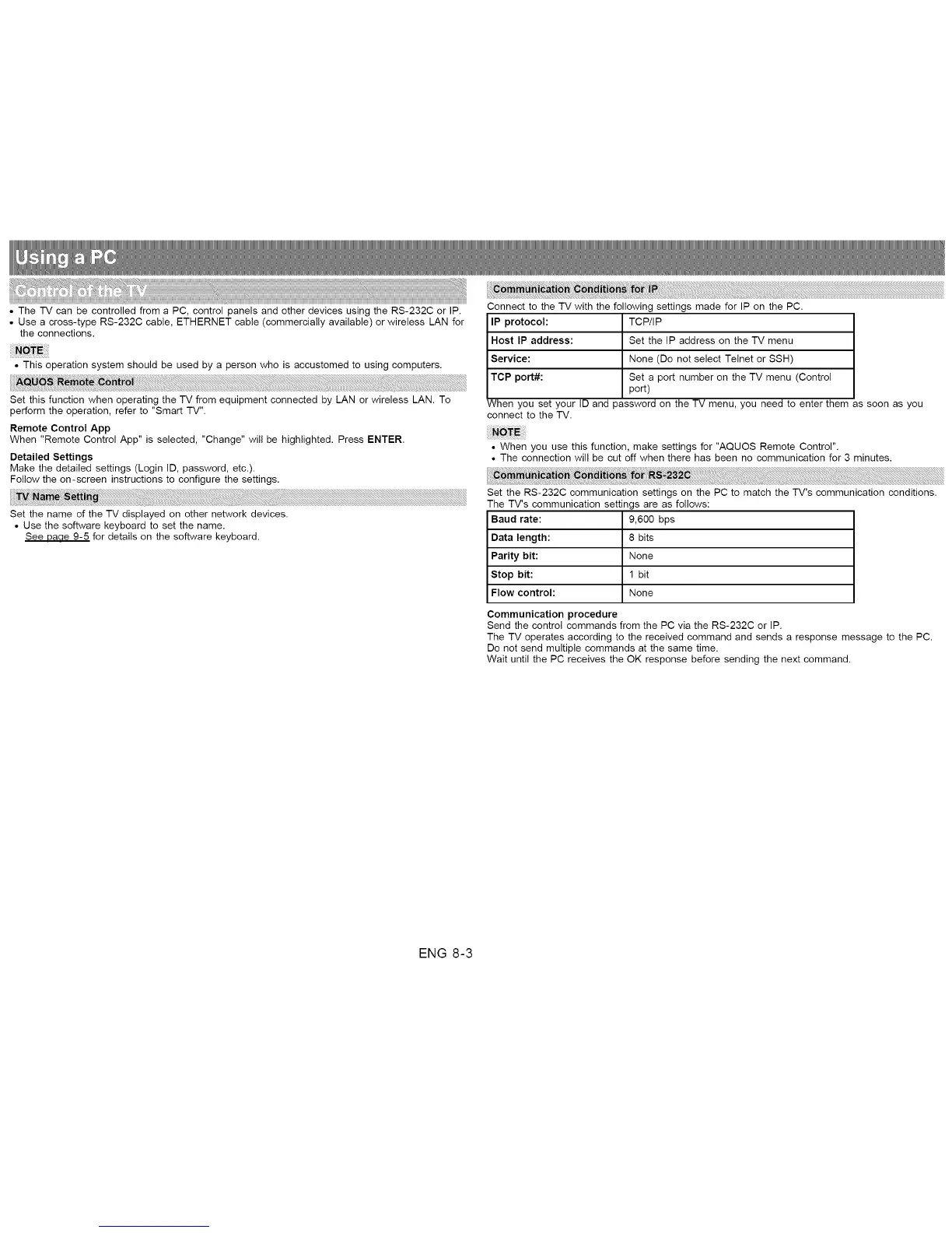 • The TV can be controlled from a PC, control panels and other devices using the RS-232C or IP.