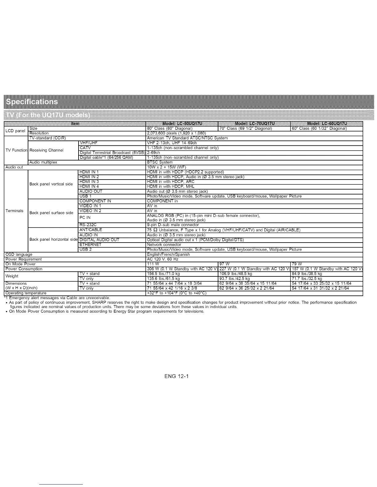 • As part of policy of continuous improvement, SHARP reserves the right to make design and specification changes for product improvement without prior notice. The performance specification